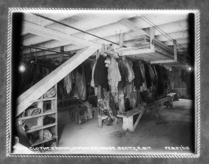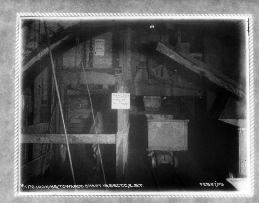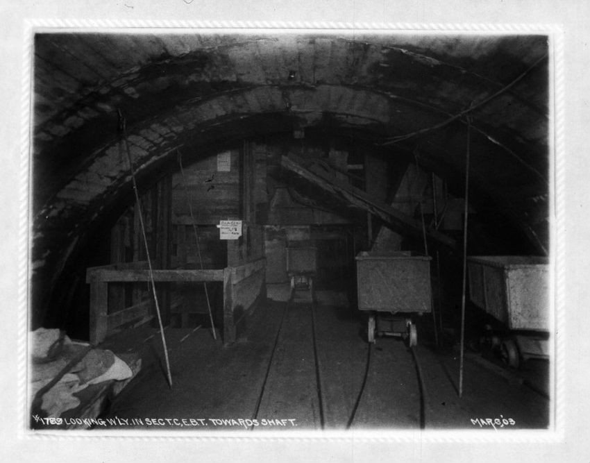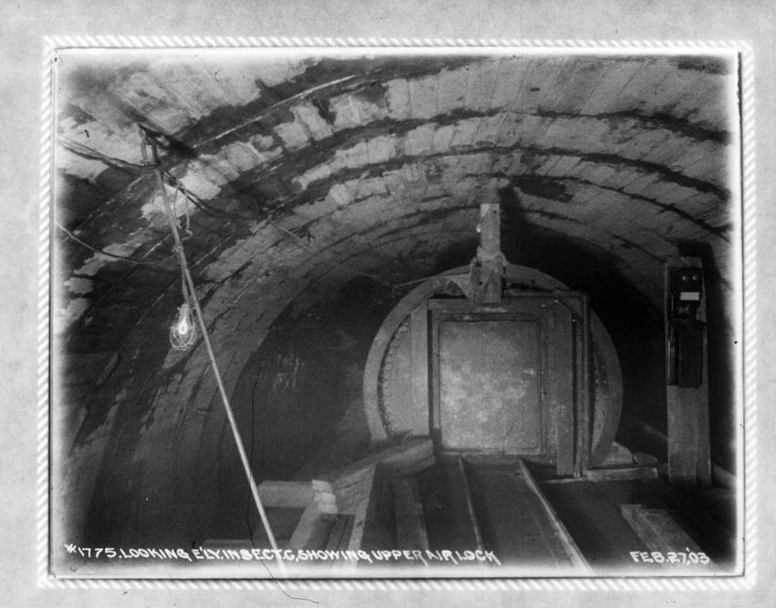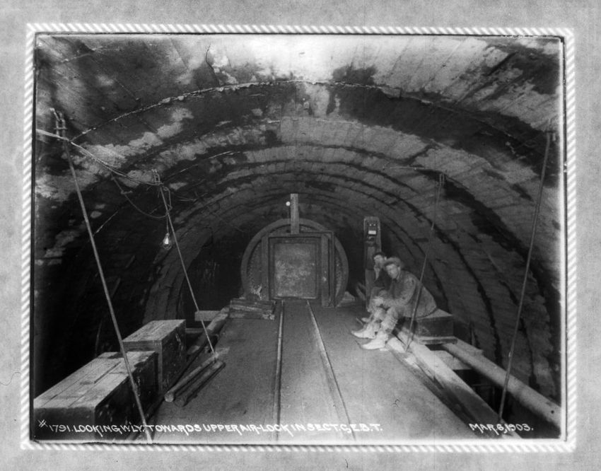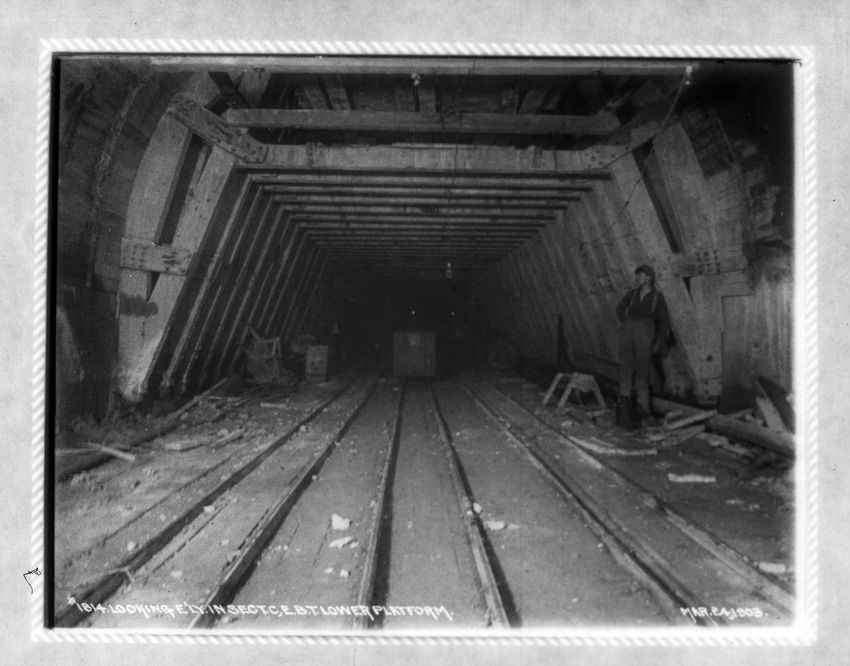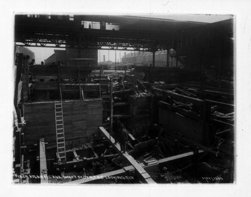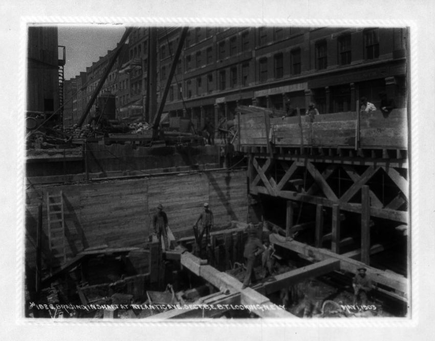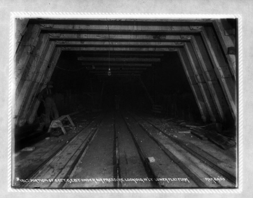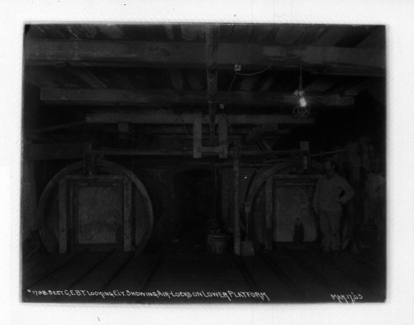 Workmen stand around the equipment for construction of the State Street Subway Station.