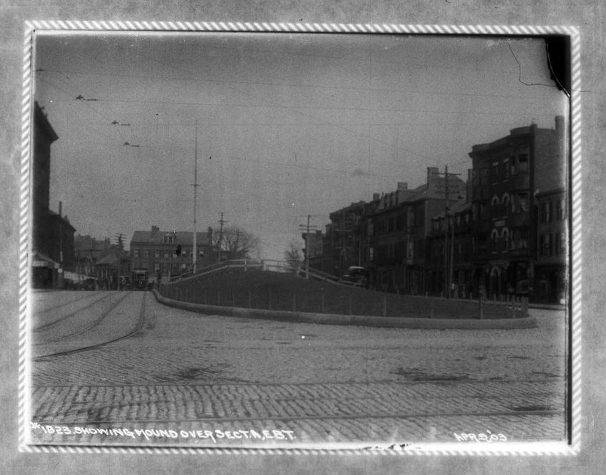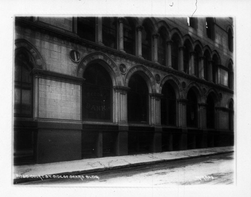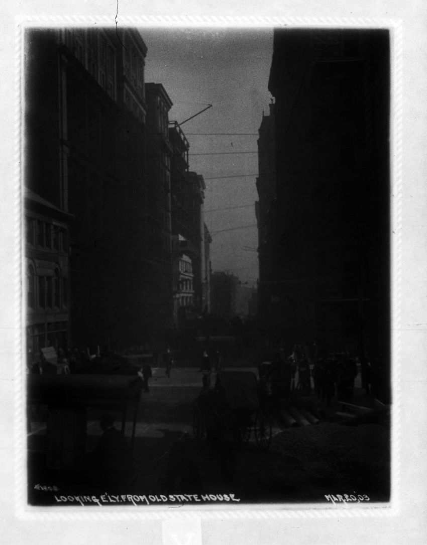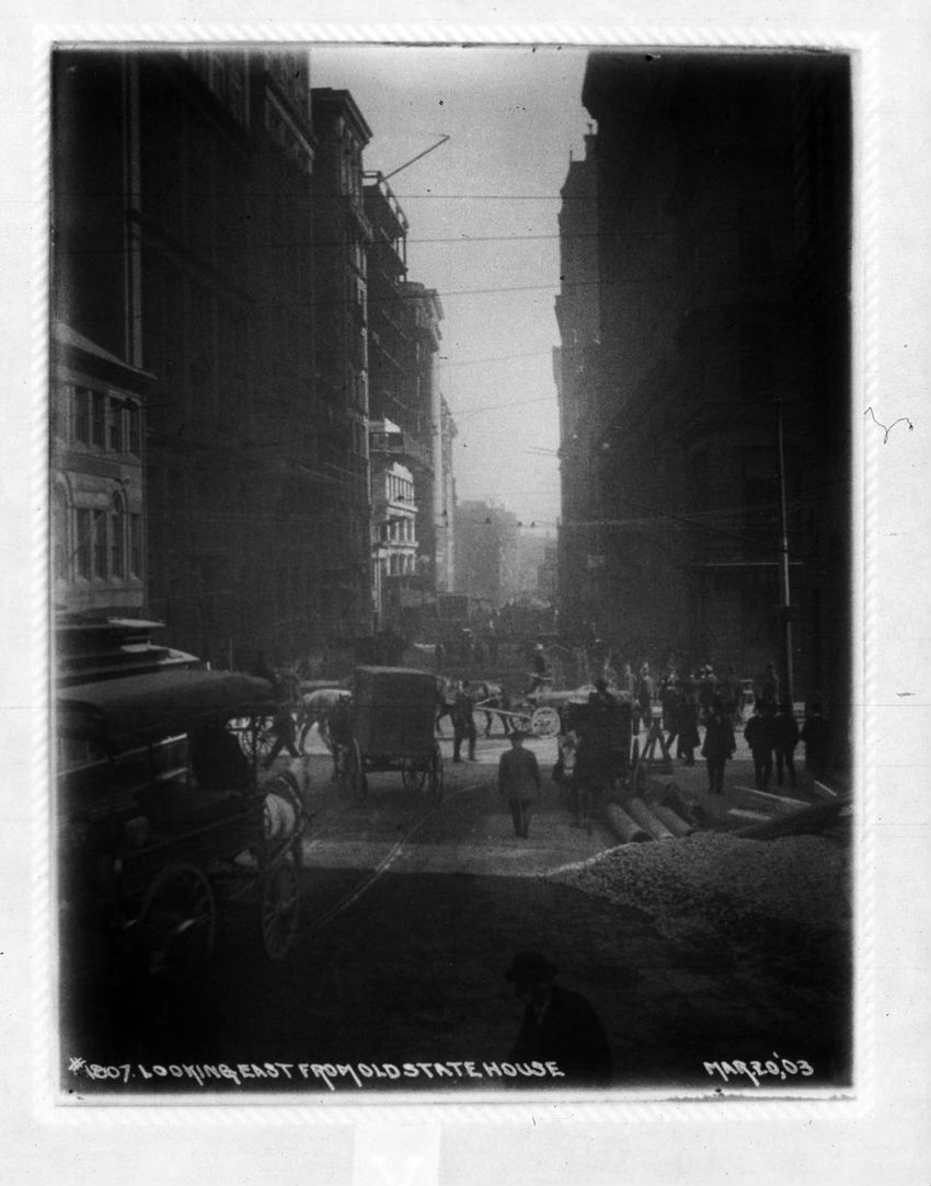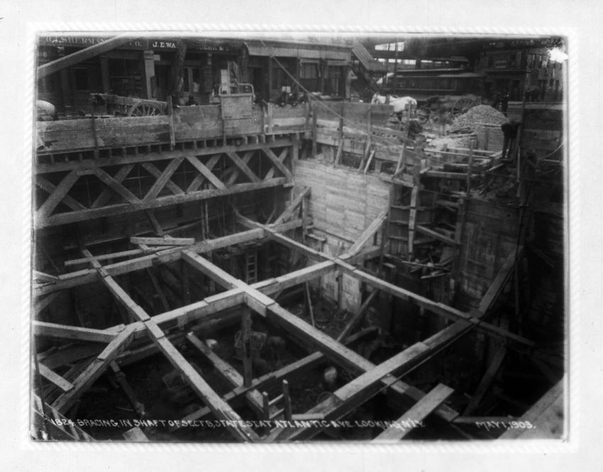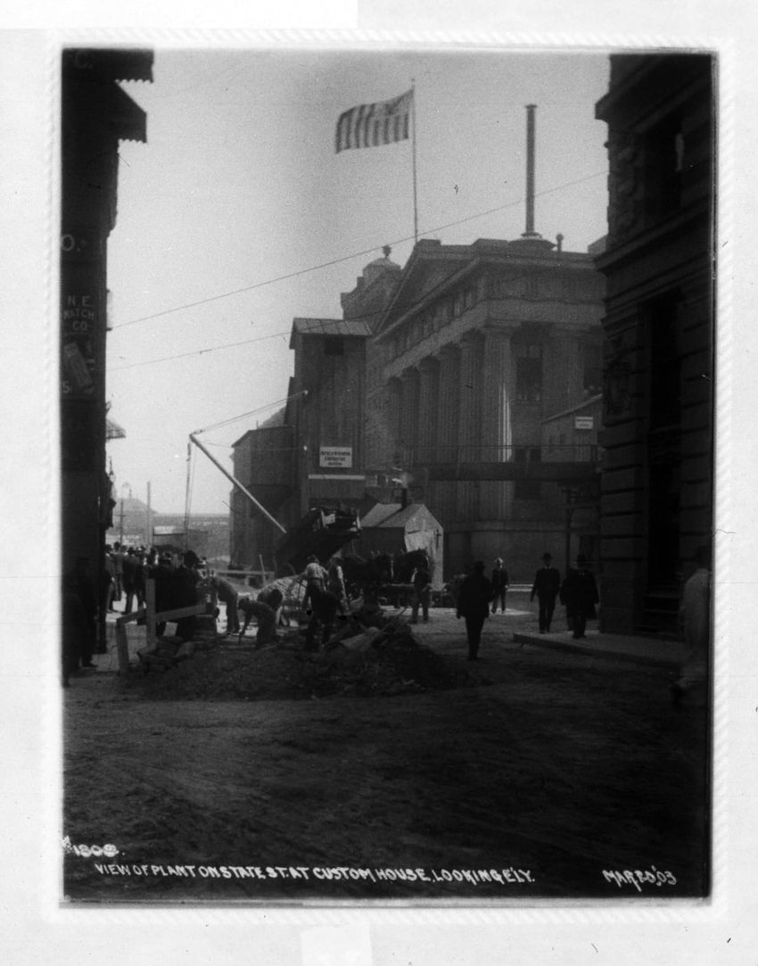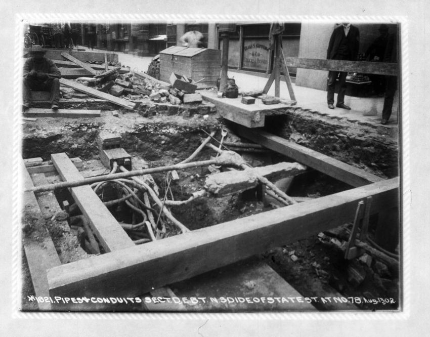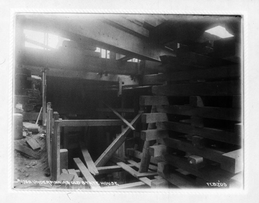 Supports below street level are seen on the south side of the Old State House during the subway construction.