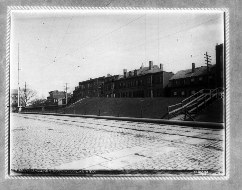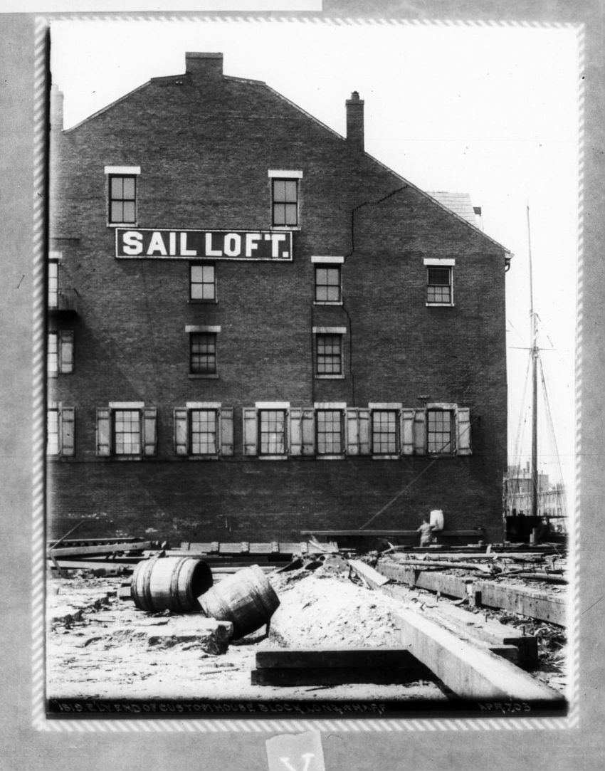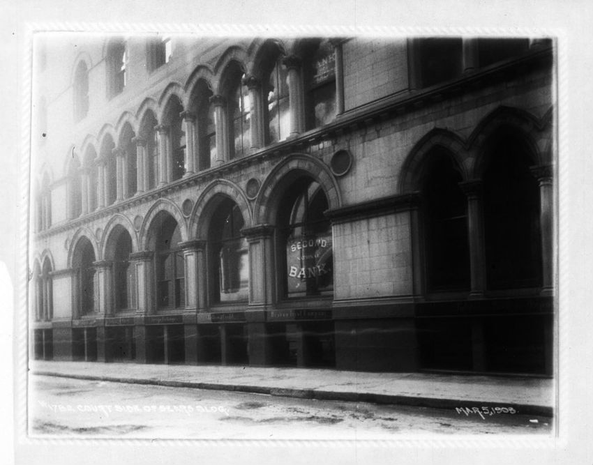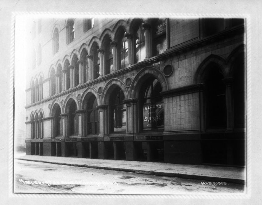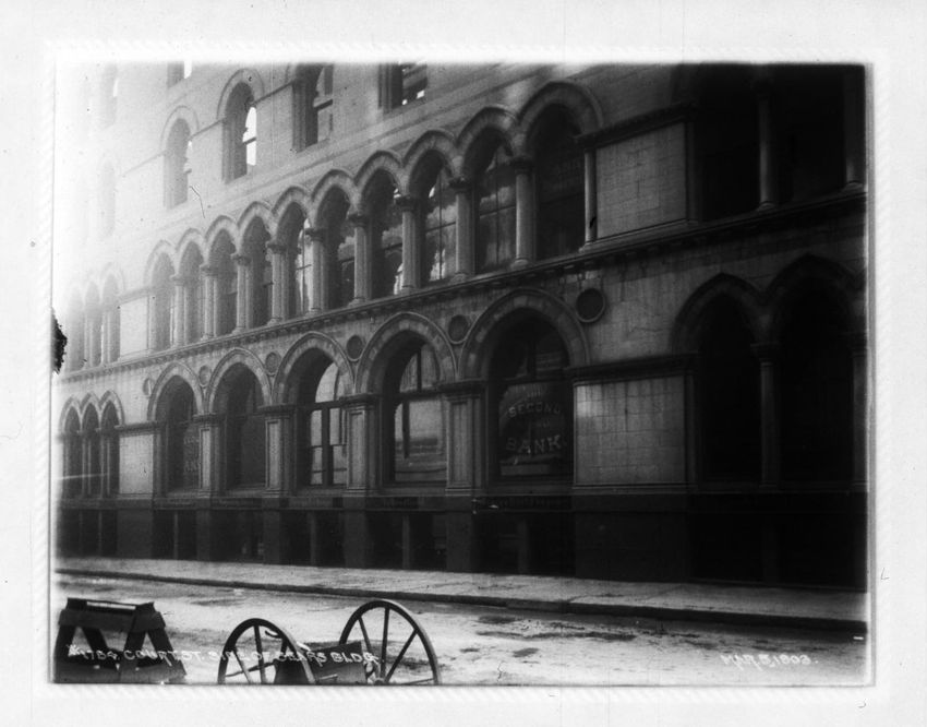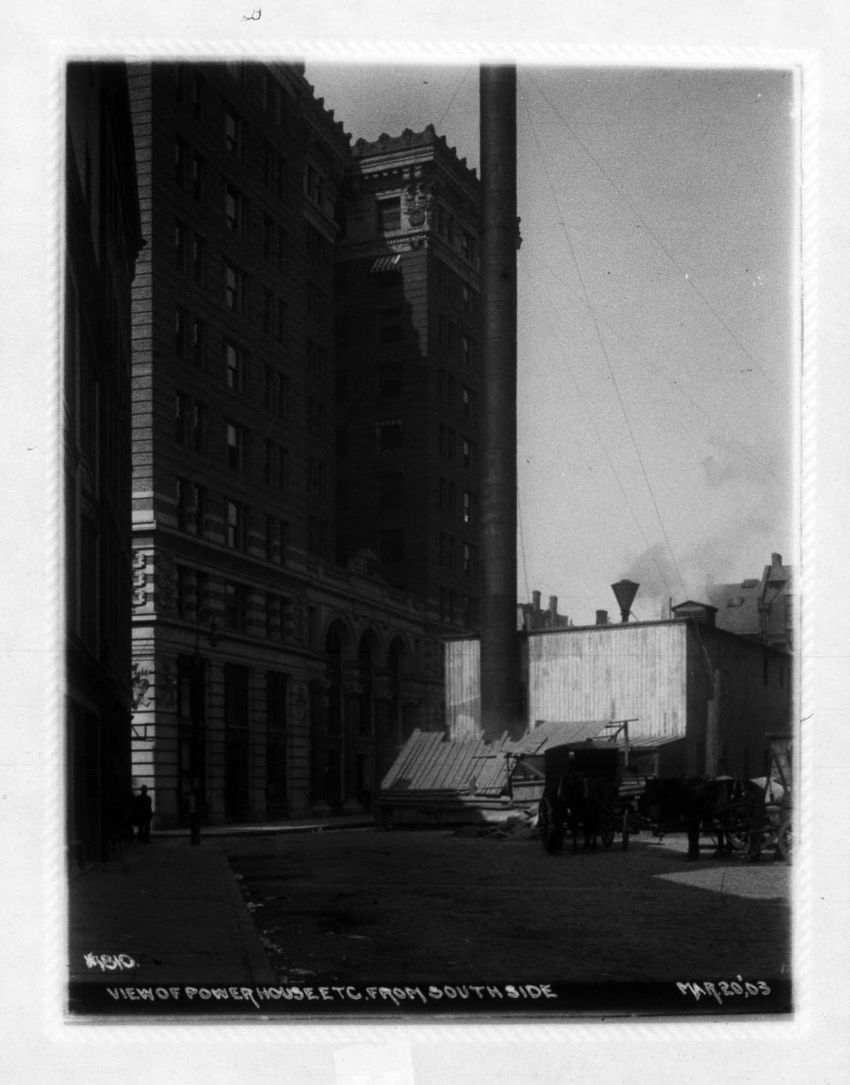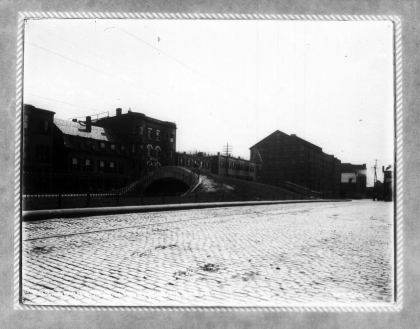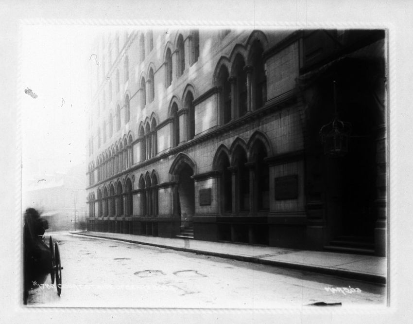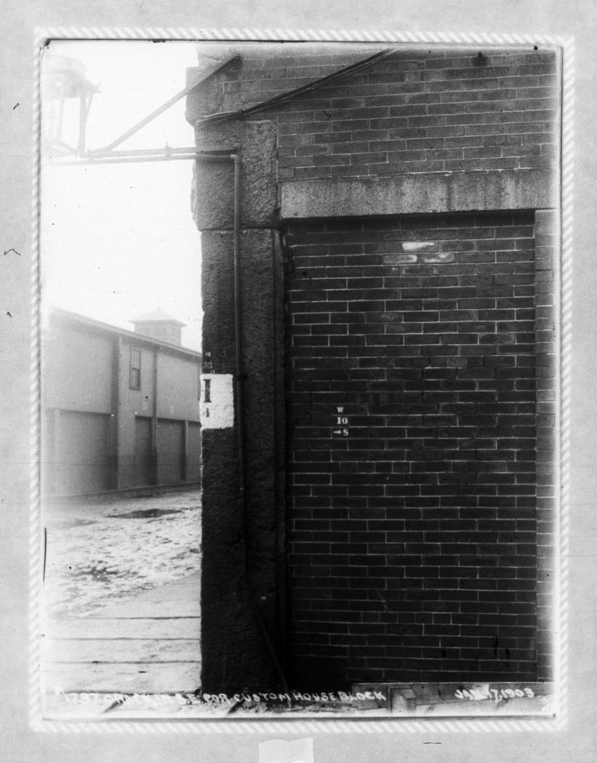 Supports below street level are seen on the south side of the Old State House during the subway construction.
