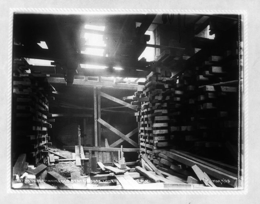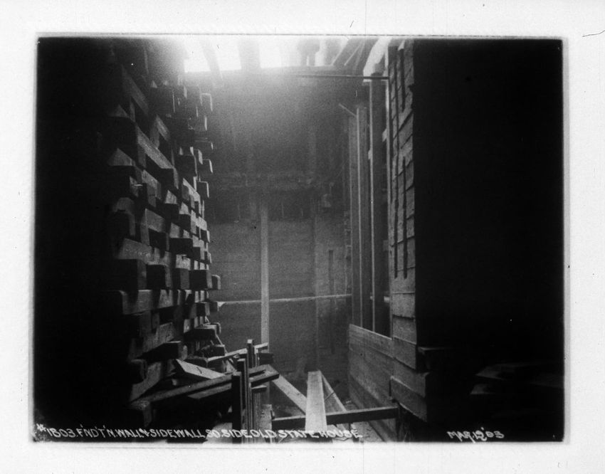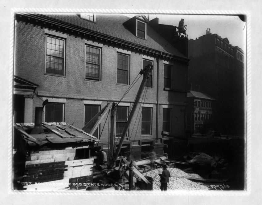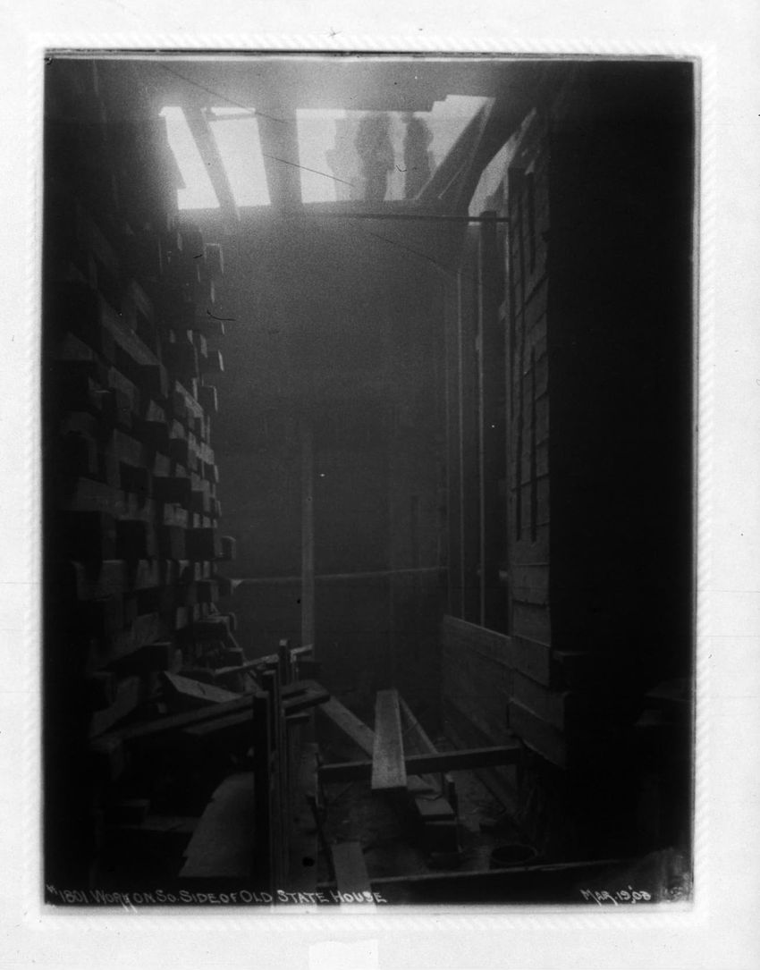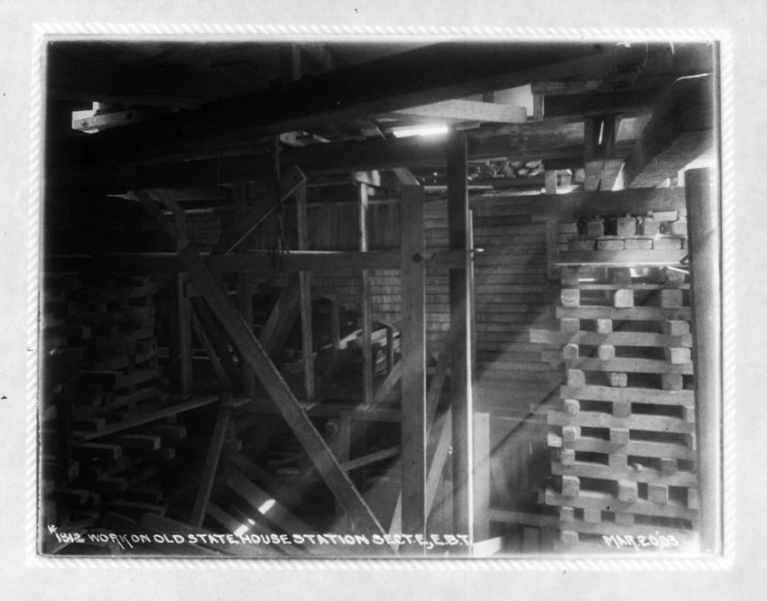 Supporting structures can be seen for building the State Street Station in the Old State House.