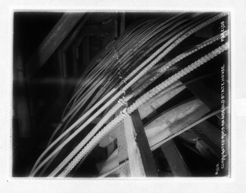Corrugated rods are held in place at the Old State House construction site for the subway system.