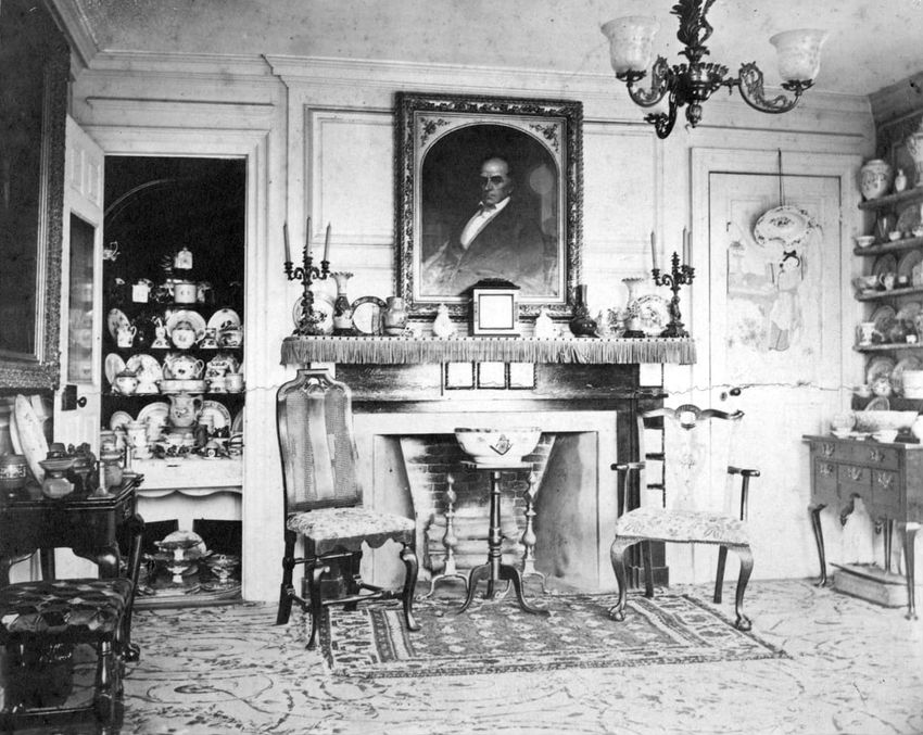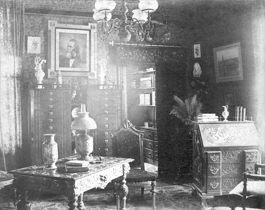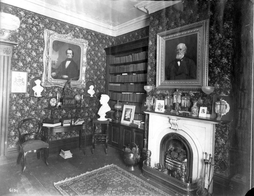 Interior photograph of the library in the Russell House, Cambridge, Mass.