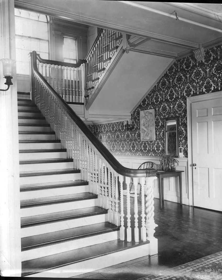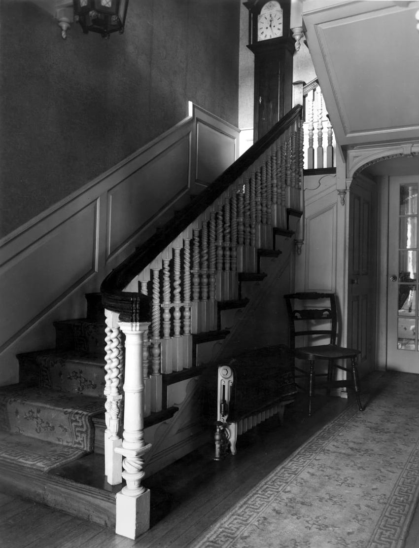 Interior photograph of a corridor and stairwell in the Belcher-Vassal House, 94 Brattle St., Cambridge, Mass.