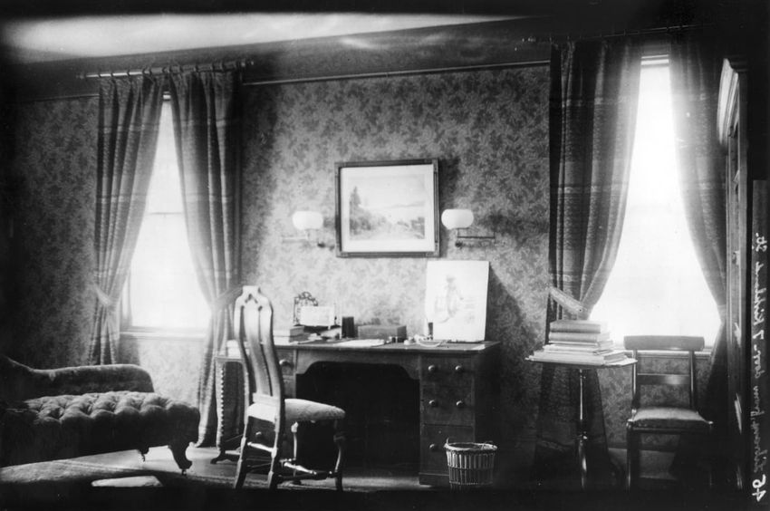 Interior photograph of the library in 11 Powell St., Brookline, Mass.