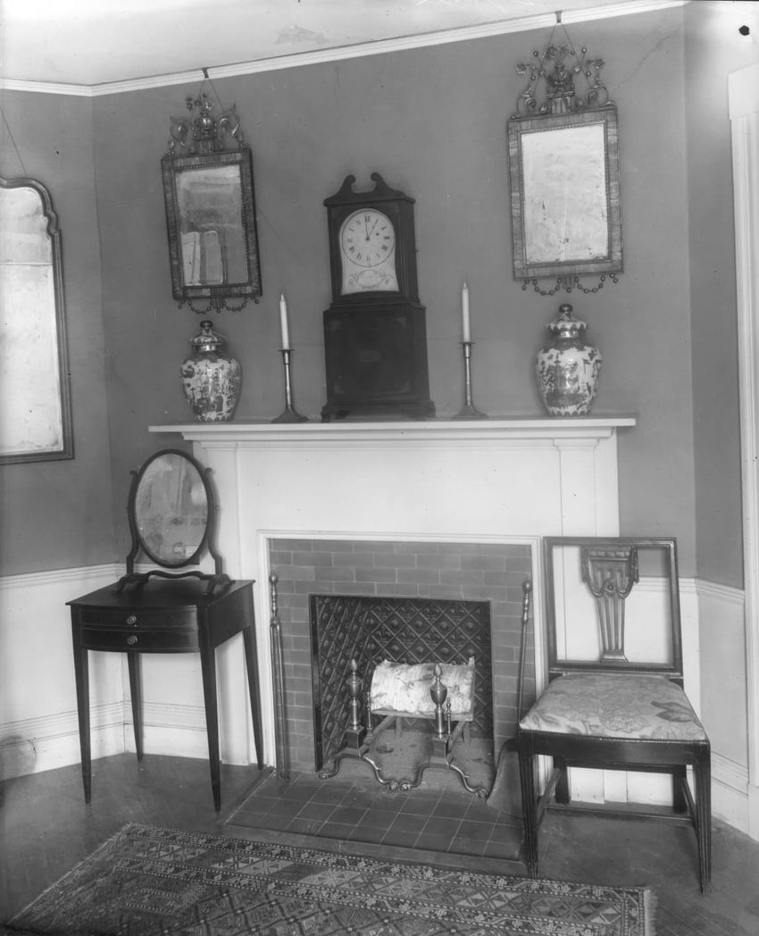 Interior photograph of the south east bedroom firelace and mantel in the F.H. Bigelow House, 4 Channing St., Cambridge, Mass.