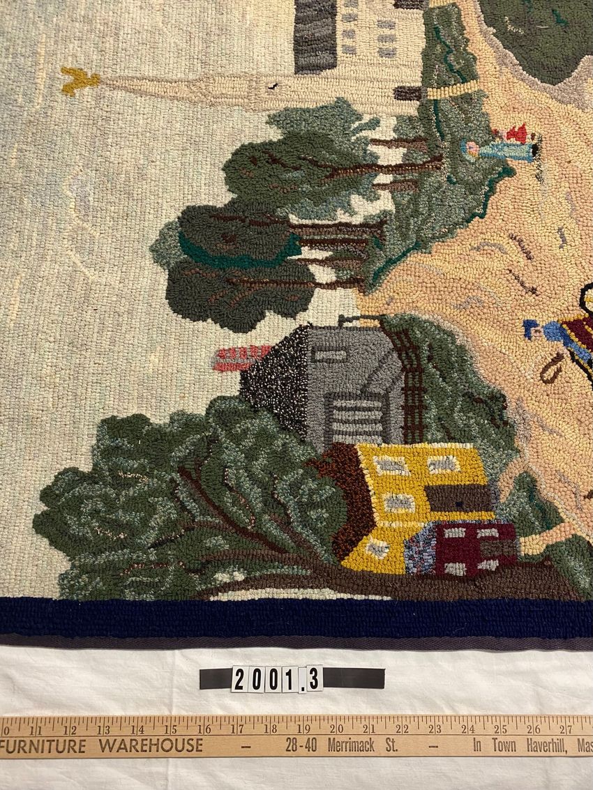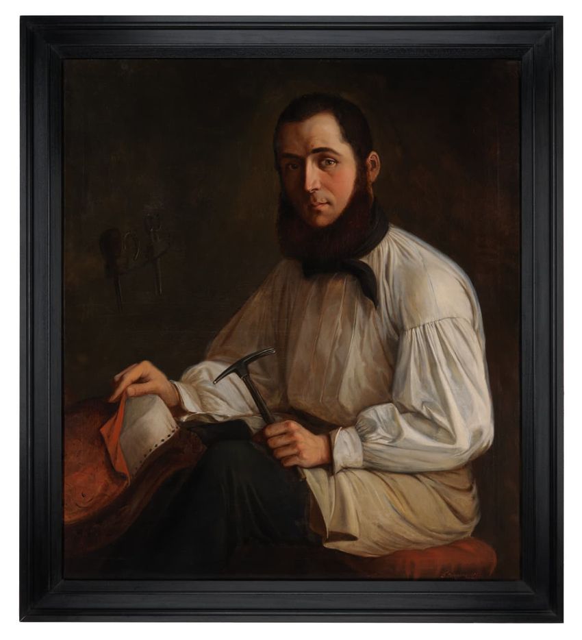 Bearded gentleman facing left, seated. White shirt, black neck tie. Hammer in left hand, upholstered chair leaning against knees. Right hand lifting red upholstery on a Rococo revival side chair. Scissors, screwdriver(?) and third tool attach to wall at left of portrait. Frame is not original.