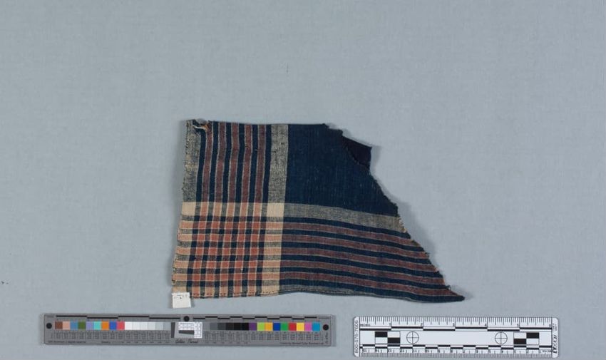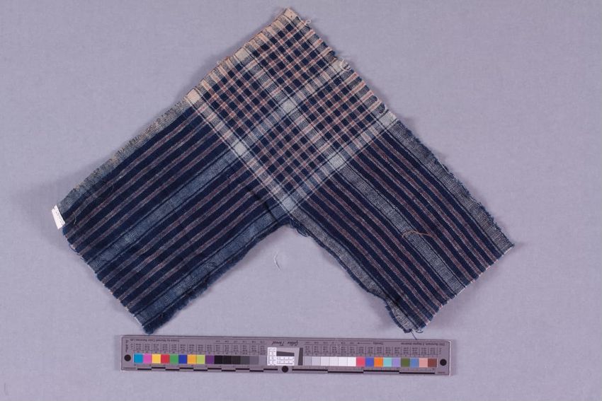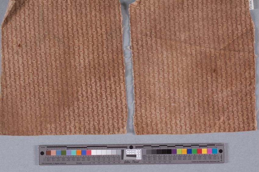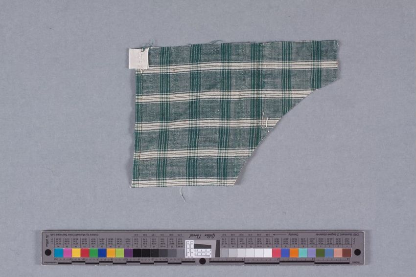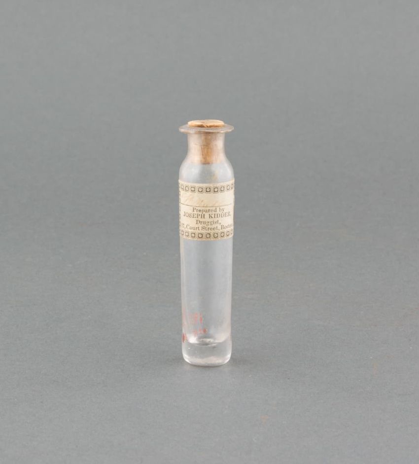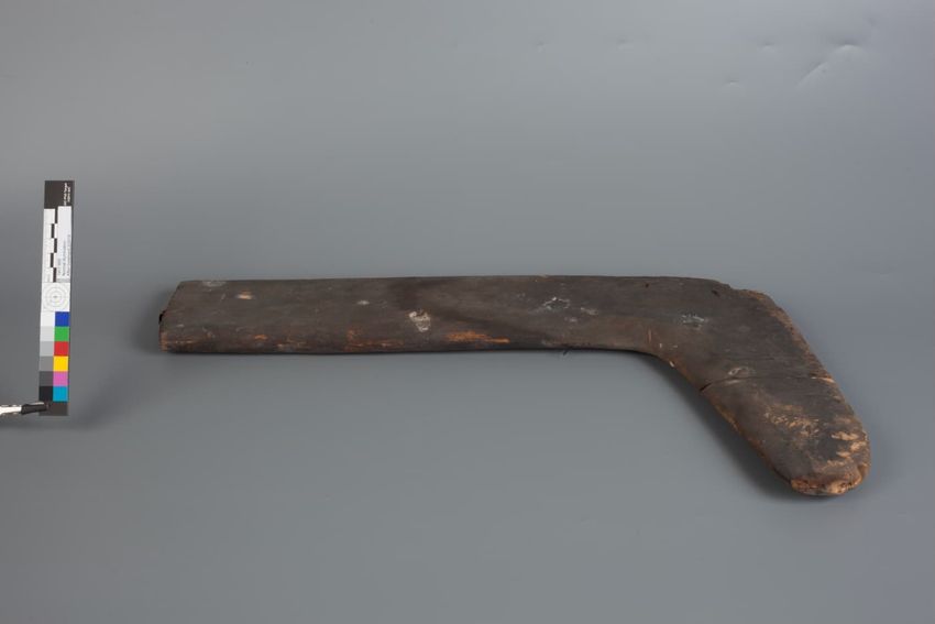 Engraved powder horn with recessed spout for metal tip (now missing), raised ring, scalloped throat, pierced lobe, and flat plug. Engraved images include vines, waves, and horse-like animal; one section has been scraped clean.
