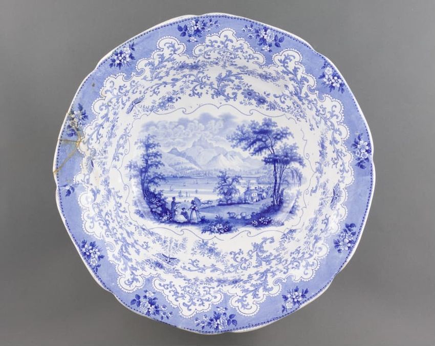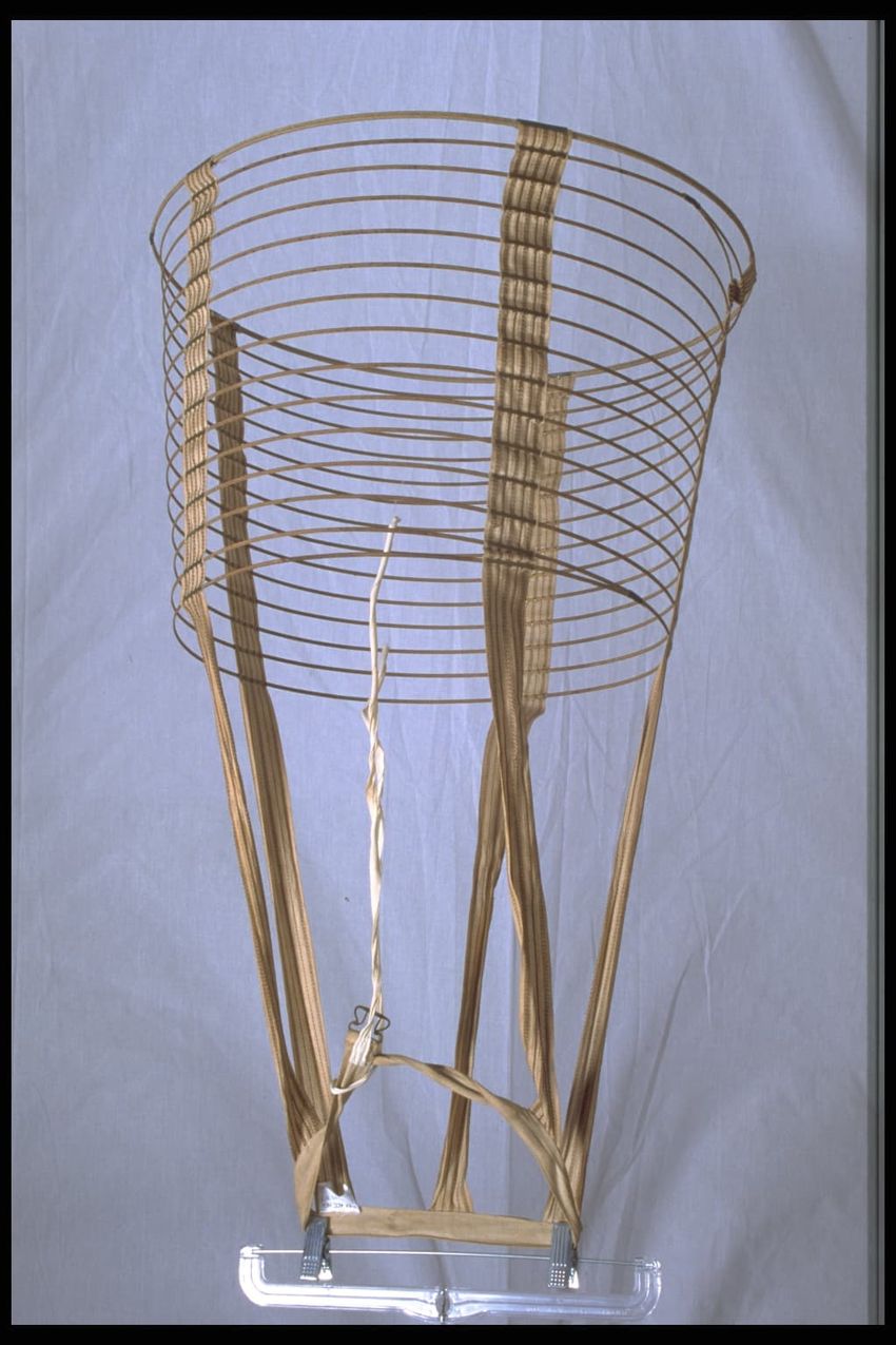 Trunk. Pine, leather, brass, iron. Newspaper lining, with notices dated 1830 and labeled Kennebunkport, Portland, etc. Rectangular form with hinged lid. Pine carcass with black leather covering. Leather reinforced edges with brass studs. Cast iron C-shaped handles at sides. Two express company la...