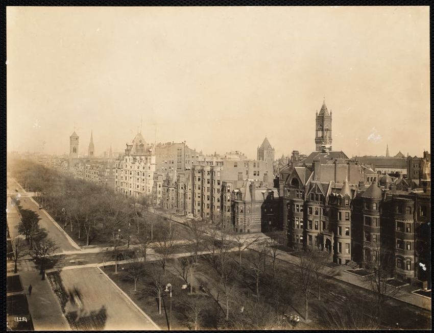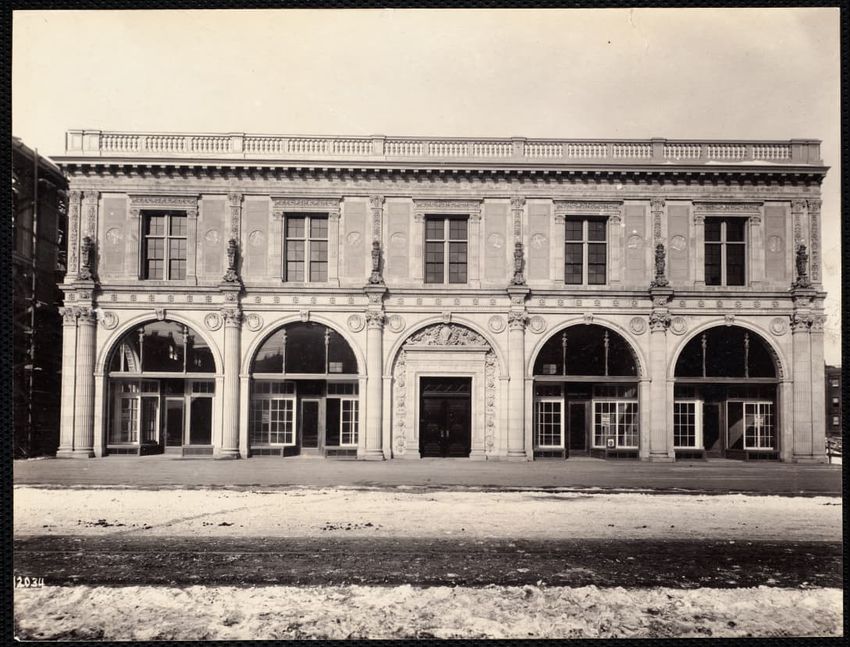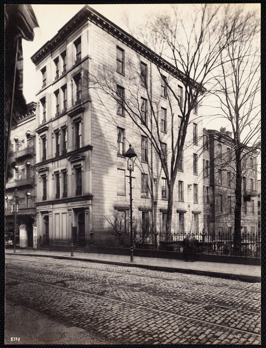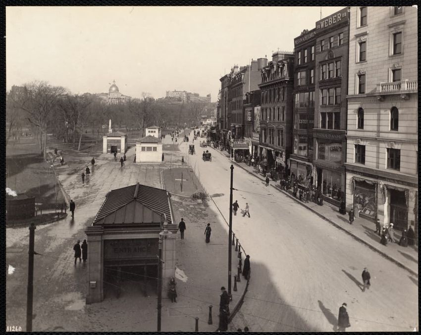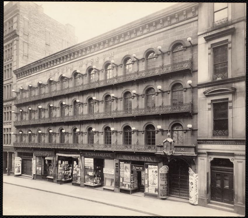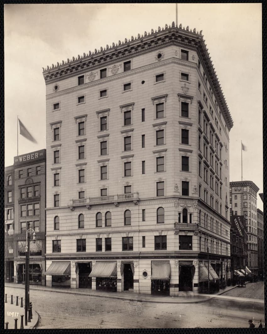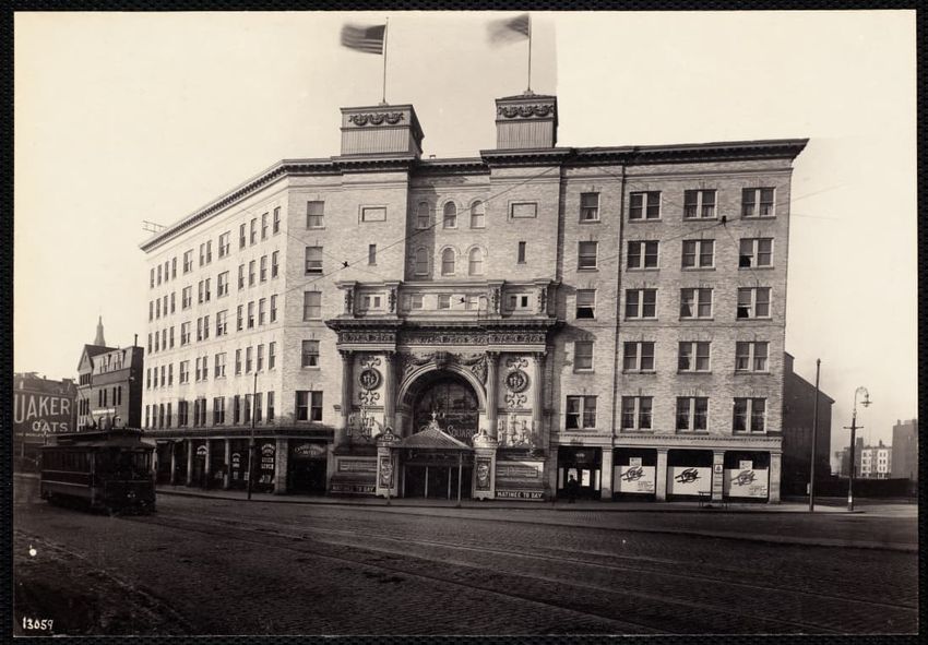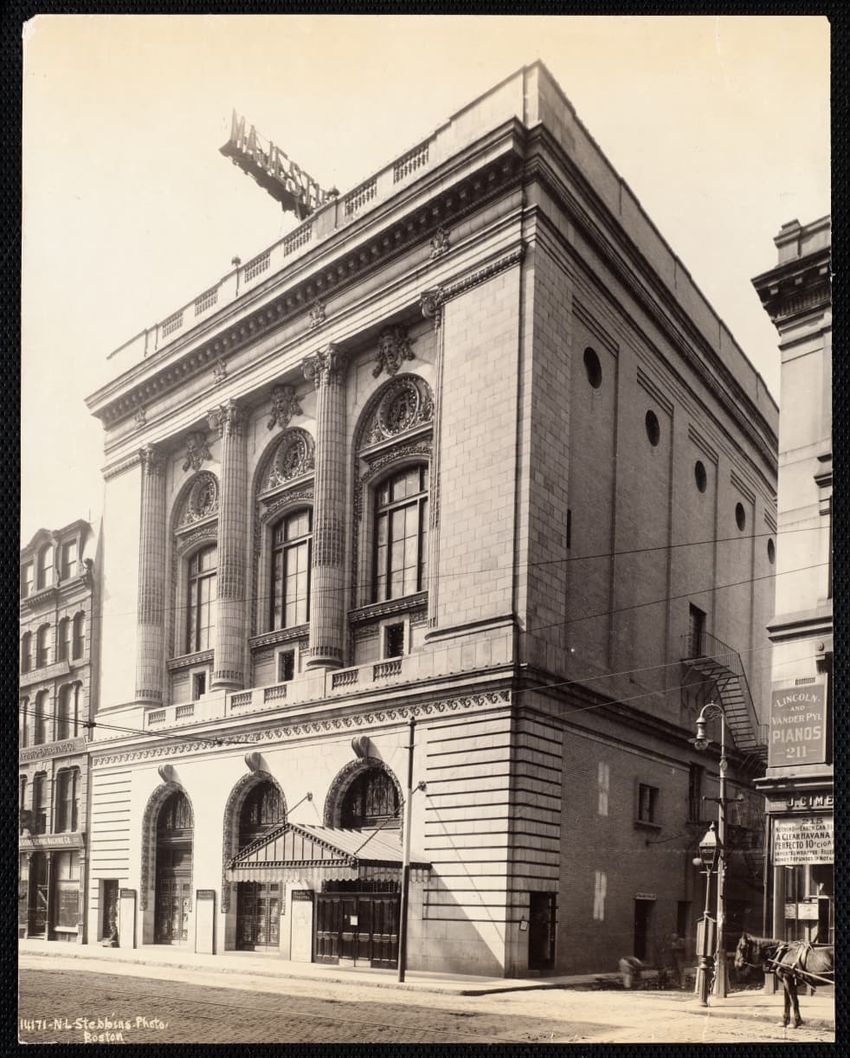 The Majestic Theatre, with a large sign on the roof, can be seen in this image. To the right, and separated by Van Rensselaer Place, is Lincoln and Vander Pyl, pianos, at 211 Tremont. Below them at street level is John Cimerblatt, cigars, at 215 Tremont Street.