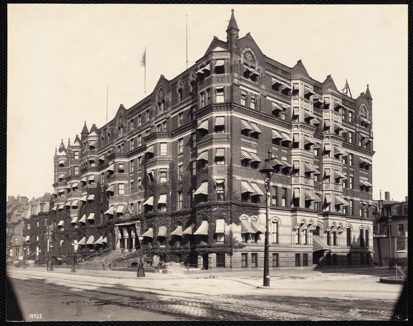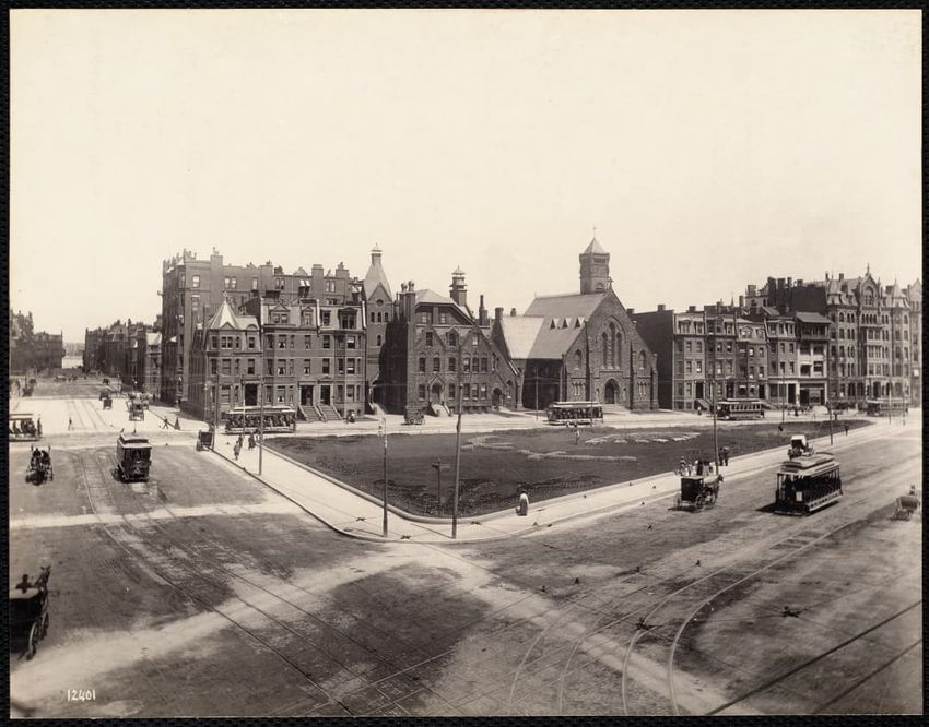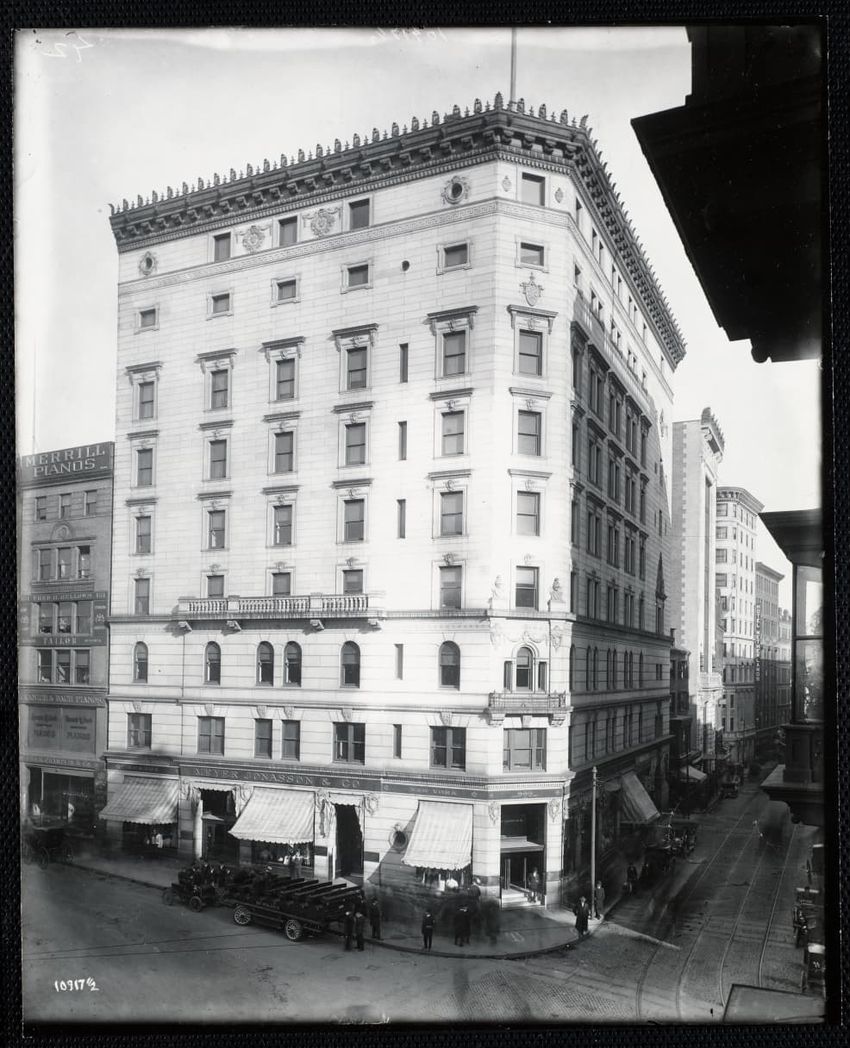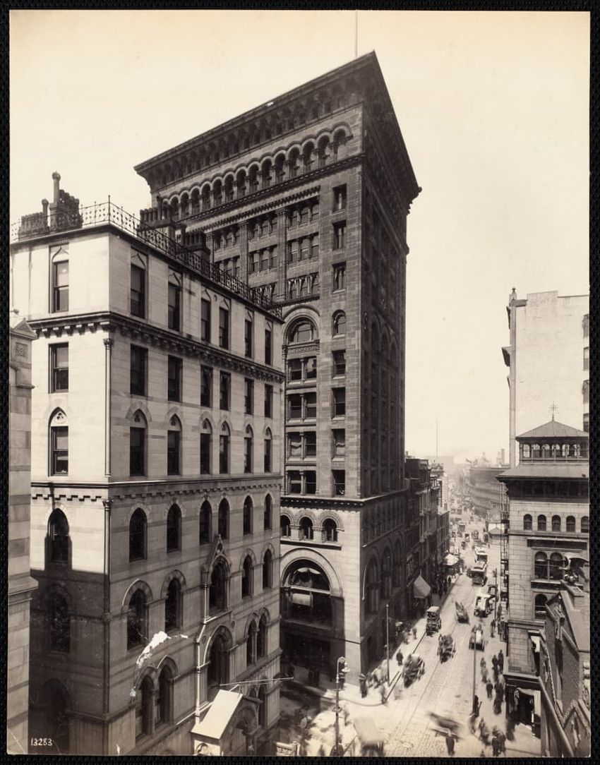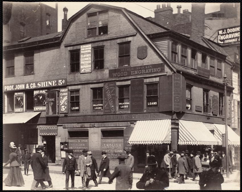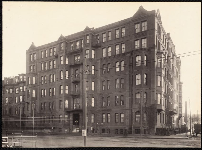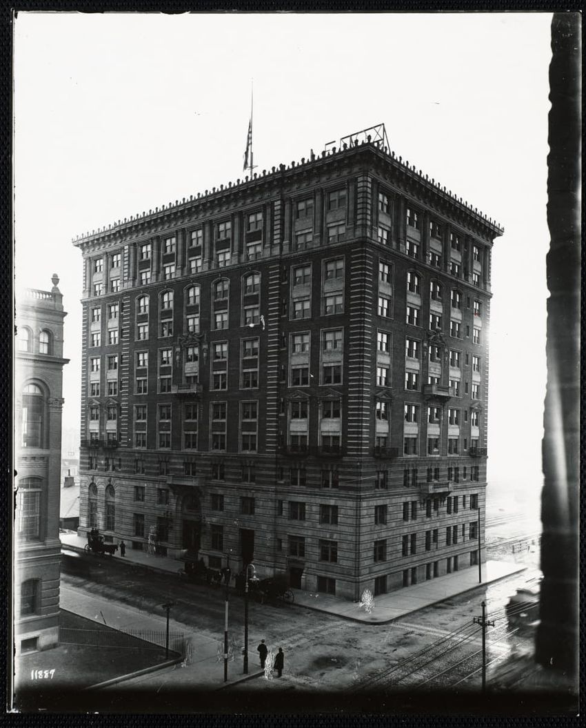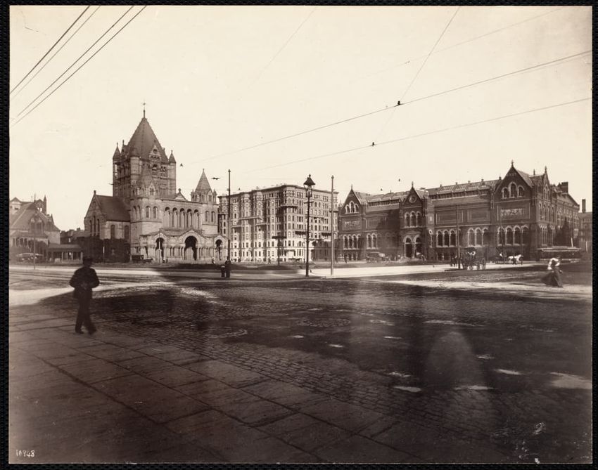The Majestic Theatre, with a large sign on the roof, can be seen in this image. To the right, and separated by Van Rensselaer Place, is Lincoln and Vander Pyl, pianos, at 211 Tremont. Below them at street level is John Cimerblatt, cigars, at 215 Tremont Street.