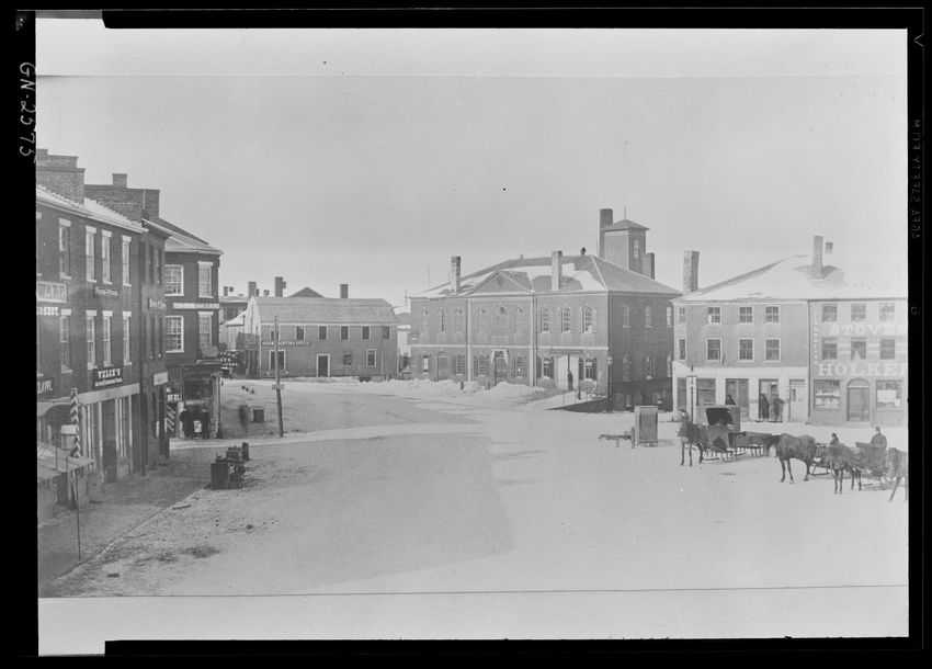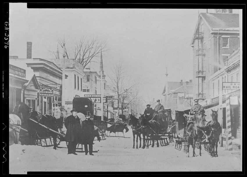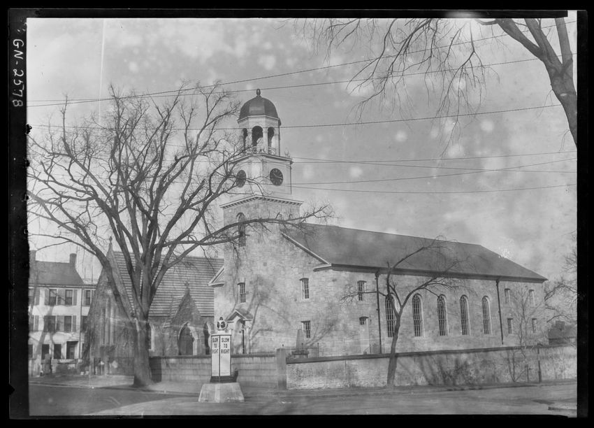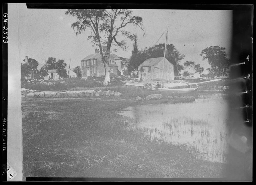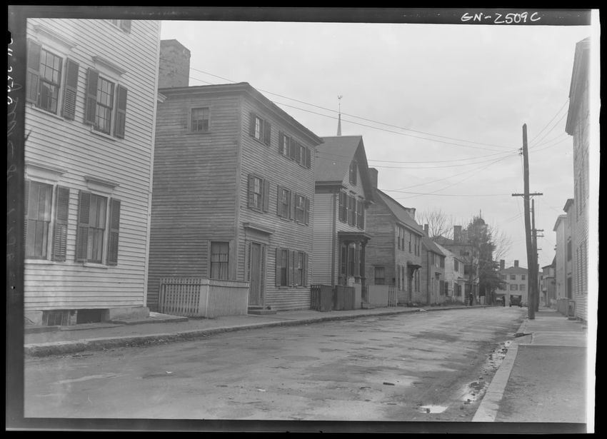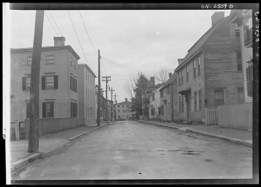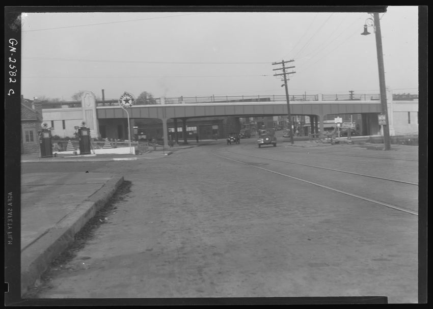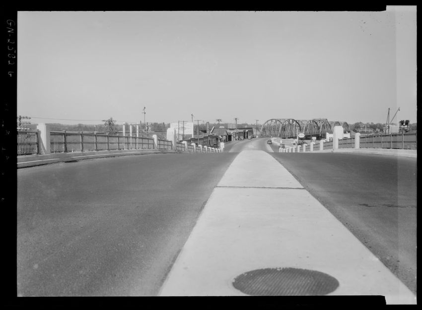 The image shows a street scene featuring a newly constructed highway. In the foreground, a man stands next to a car on the left side. A sign on the left reads "McKinney's Newsstands, Tobacco, Confectionery, Jersey Ice Cream." Houses and trees line the background, and a person is visible near one of ...