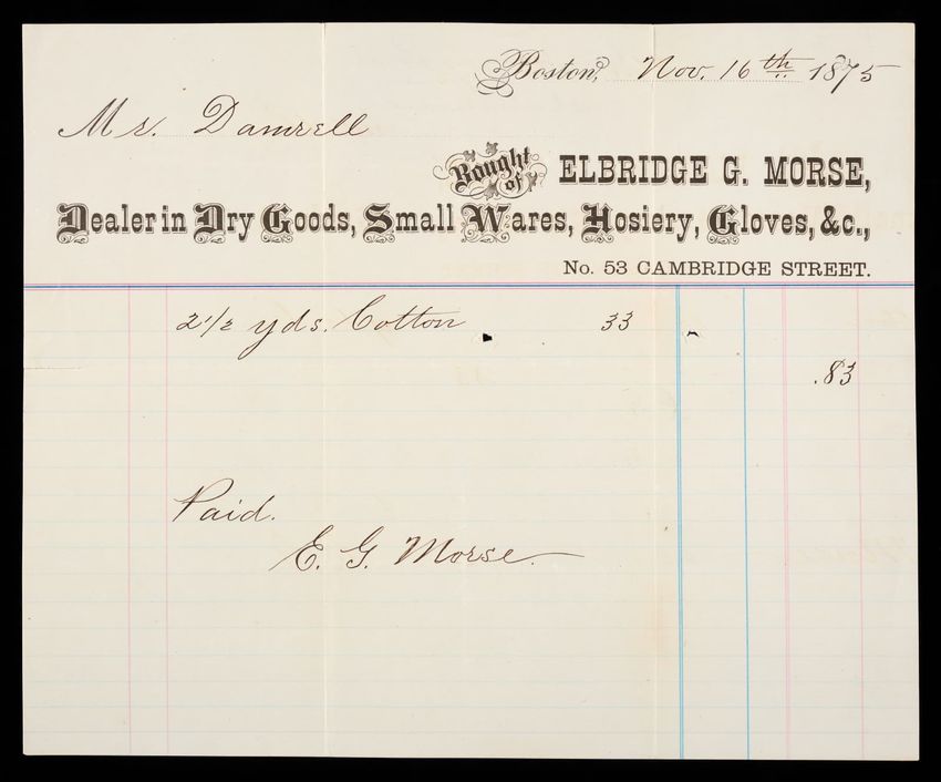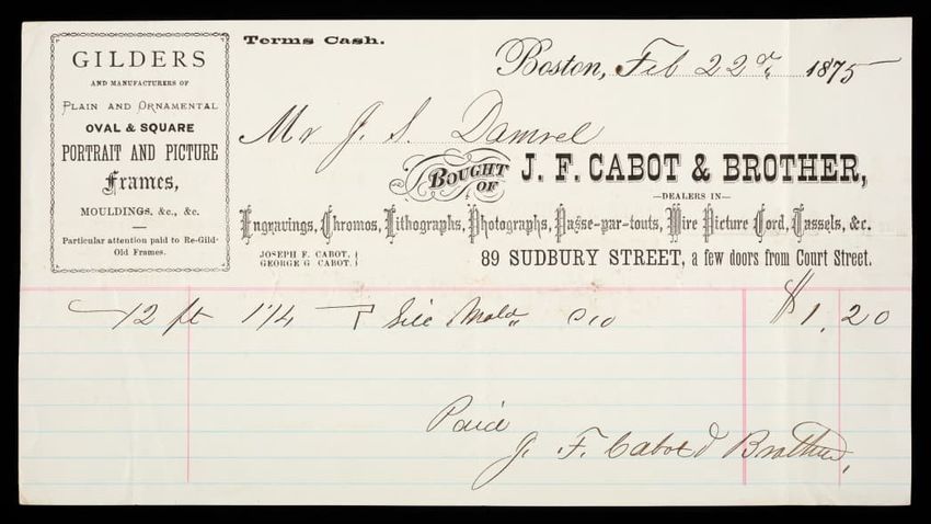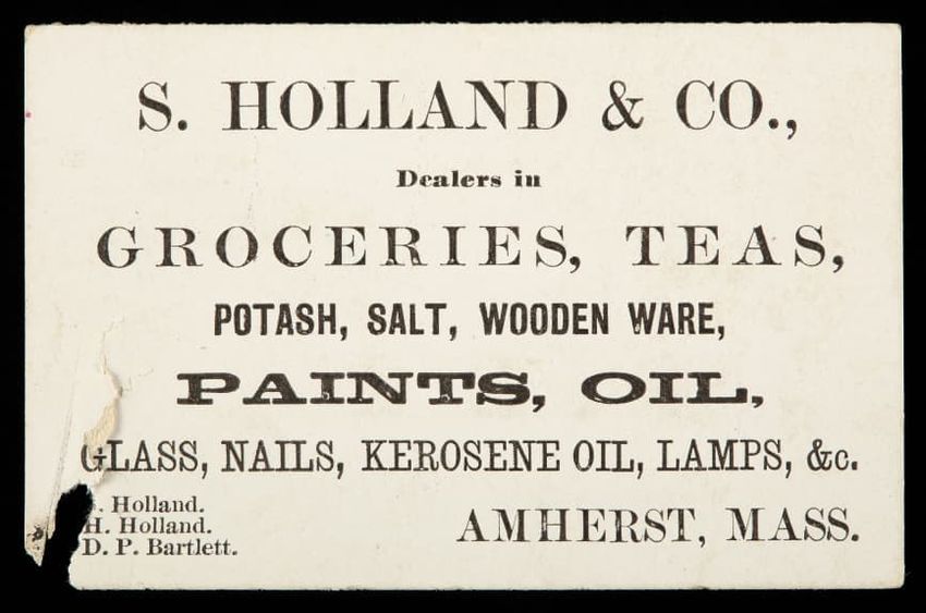 Trade card for S. Holland & Co., adveritising groceries, teas, potash, salt, wooden ware, paints, oil, glass, nails, kerosene oil, lamps, &c. in Amherst, Mass.