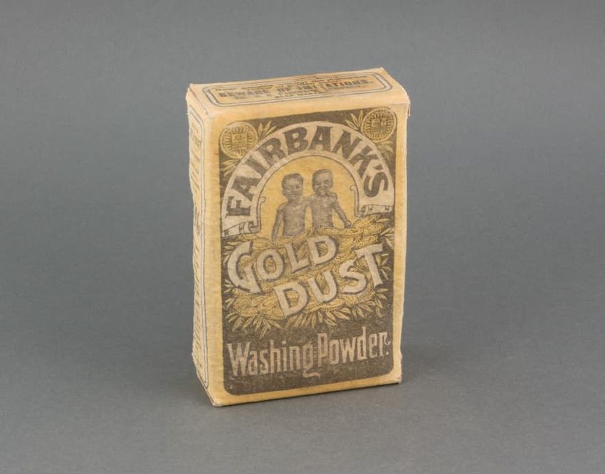 Apron hangs around neck and ties in back around waist; red border around entire edge and pocket, center left; background in white; floral design in: red, pink, light and dark blue, yellow, light and dark green throughout apron; stronger concentration of flowers with same colors across lower bottom.