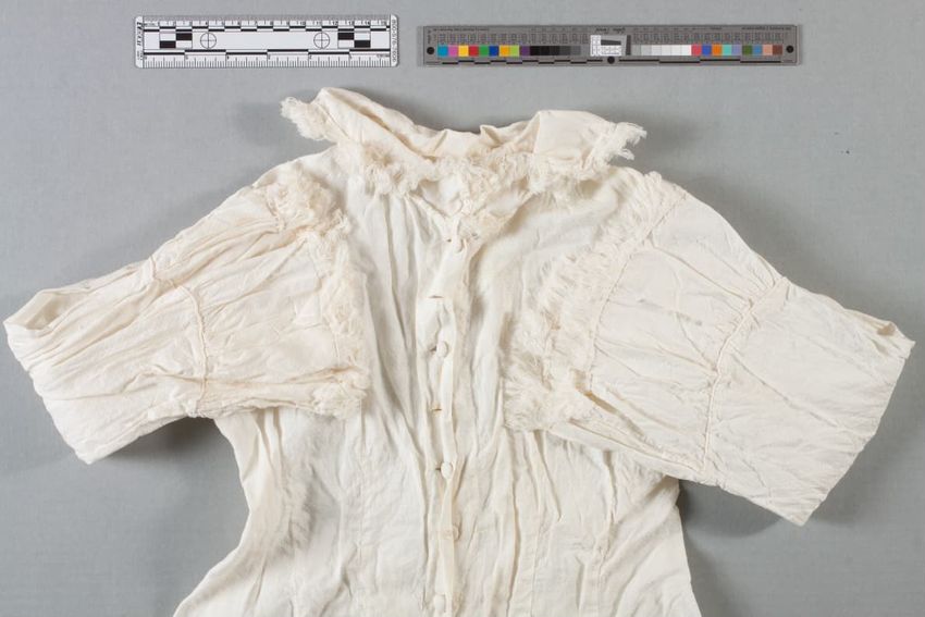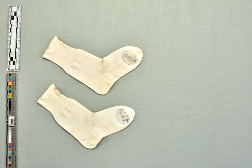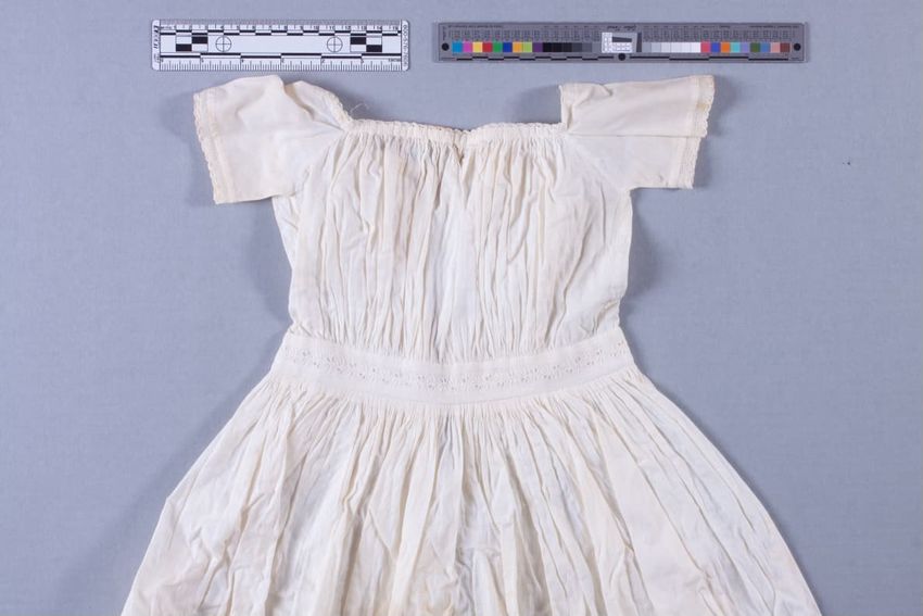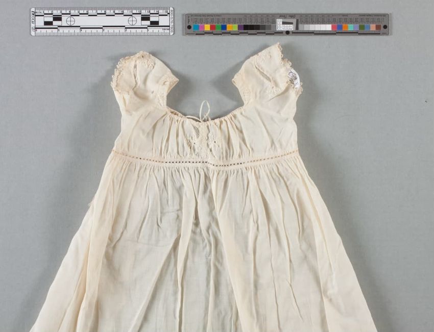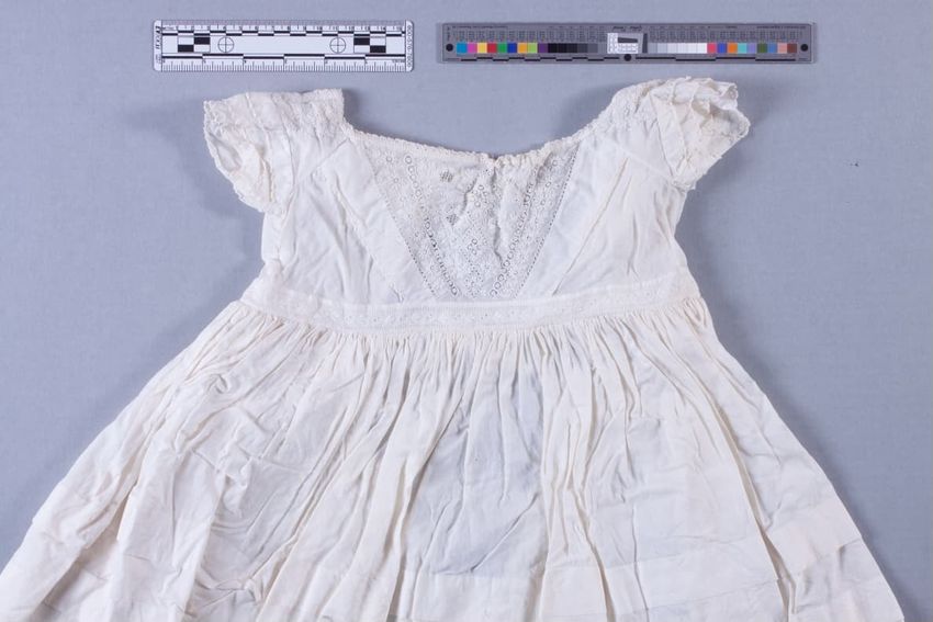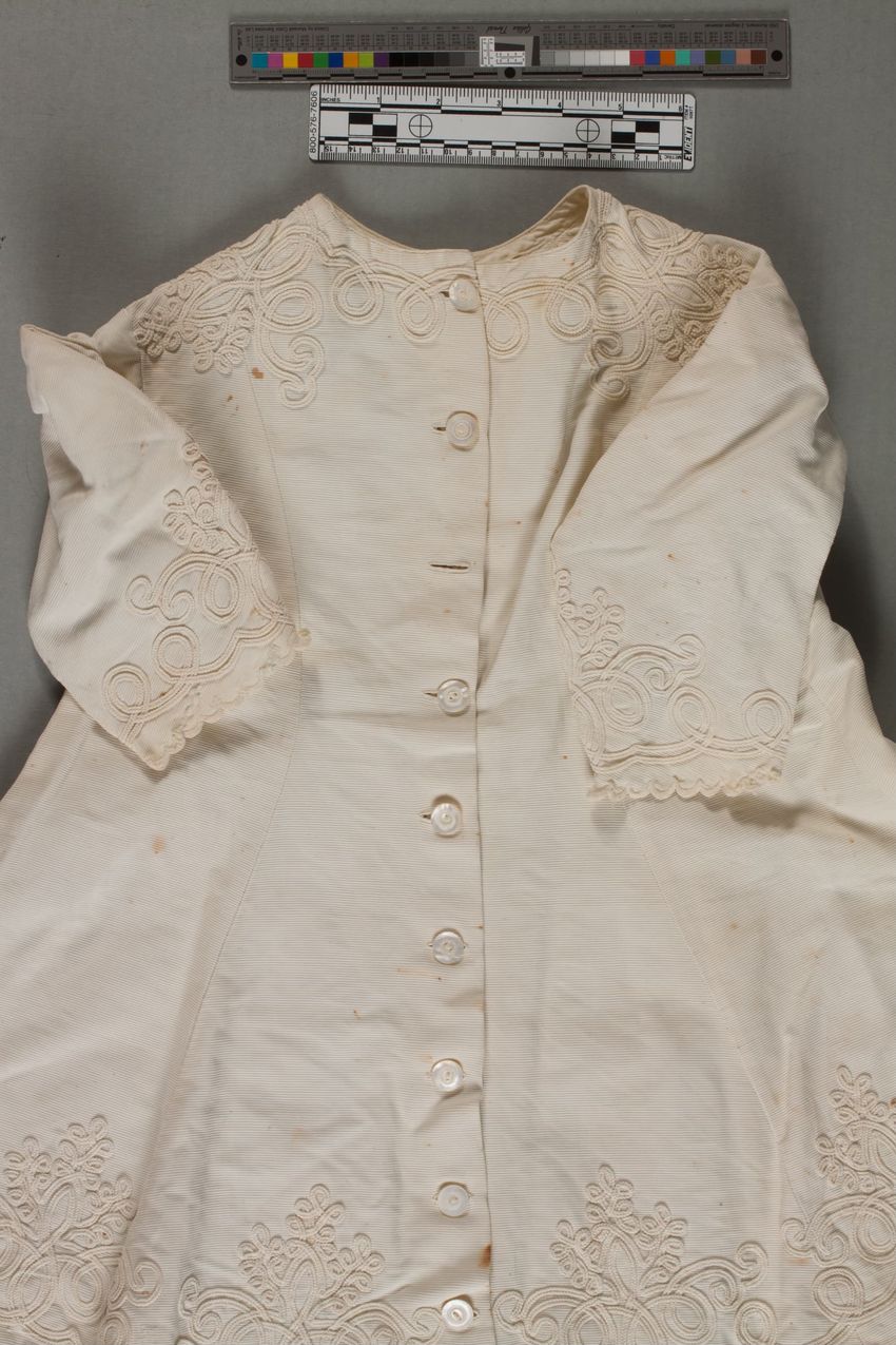White vertically ribbed cotton piqué cape embellished with white soutache (floral with Greek key motif) along center front, hem and center back; scalloped and embroidered neckline and hem. Closure at center front neckline tab with button is missing. Ensemble with 1930.1000 A and C= coat and pants.