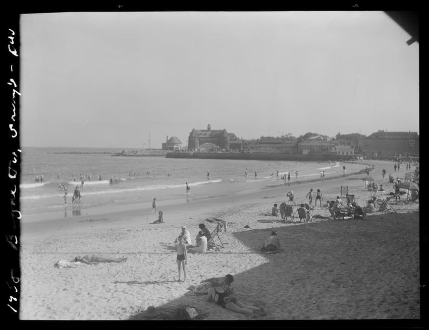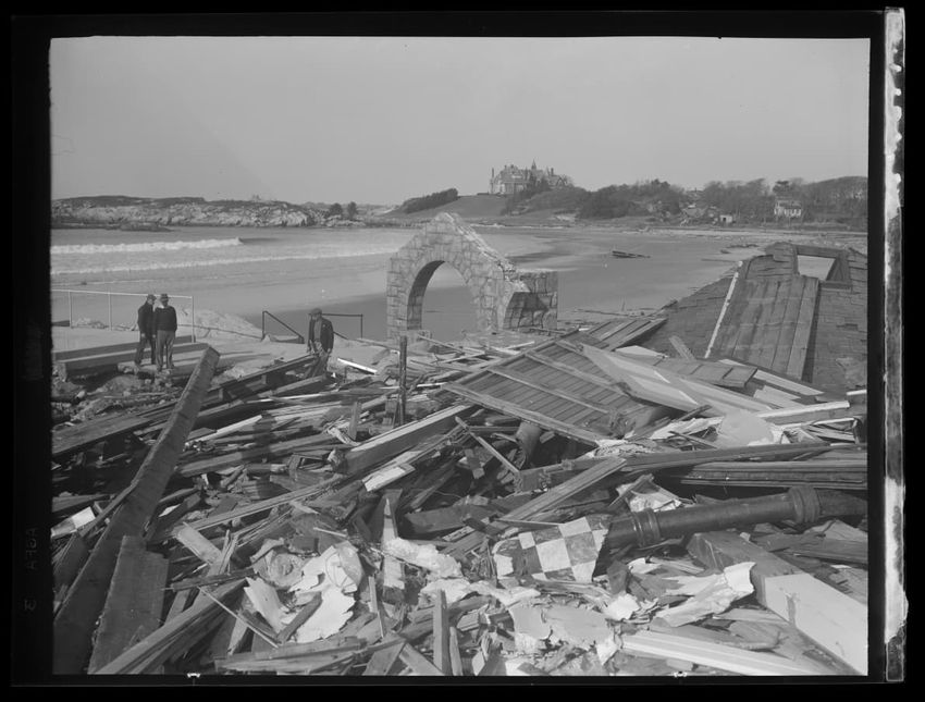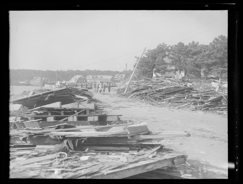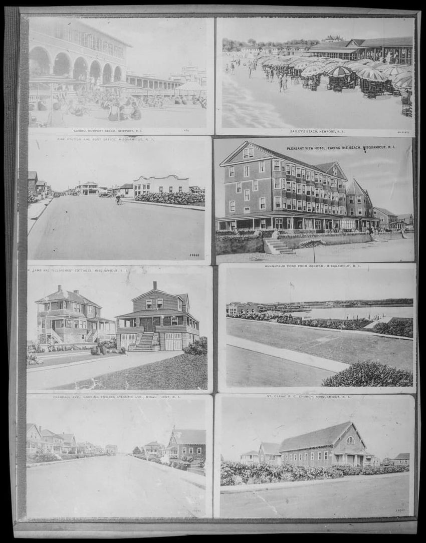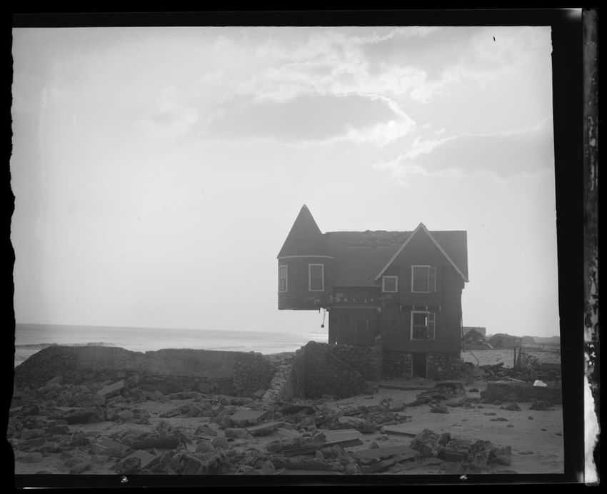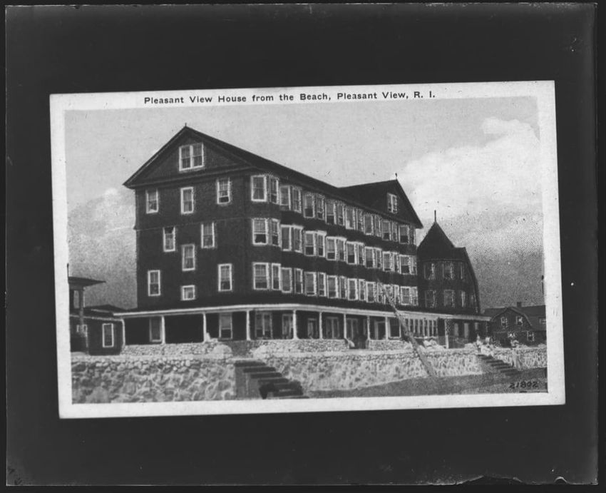 A black and white image showing what looks like a postcard of the Pleasant View House in Pleasant View, Rhode Island. The caption reads, "1938 Hurricane (before), Pleasant View House, Misquamicut, R.I. (original label) [inscription on neg.: 'Pleasant View House from the Beach, Pleasant View, R.I.']....