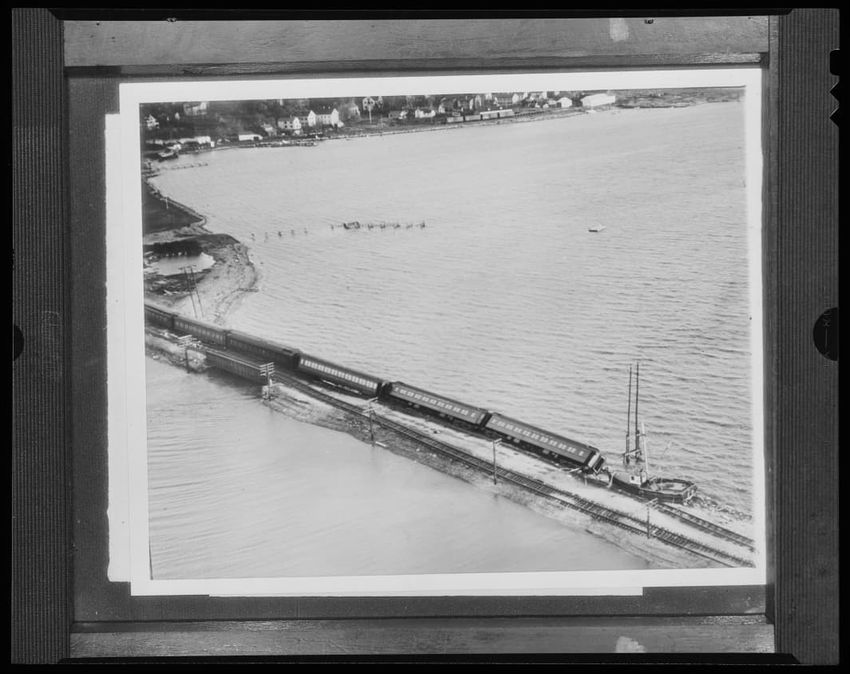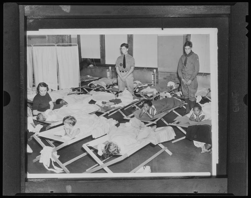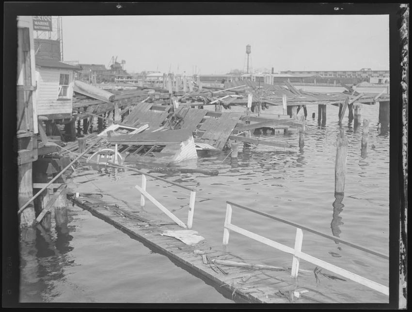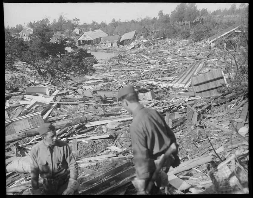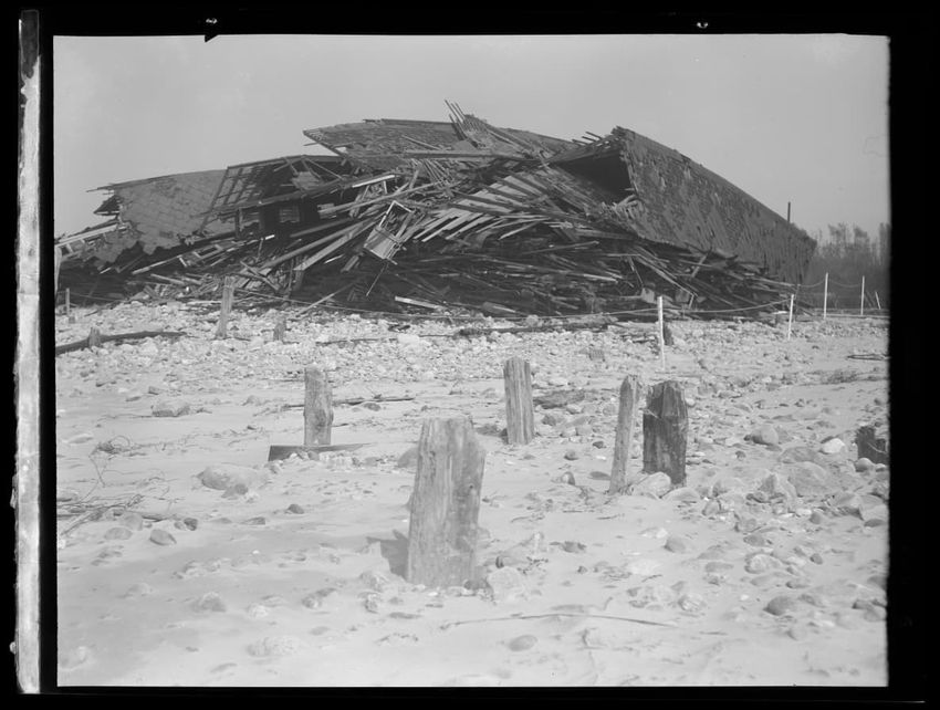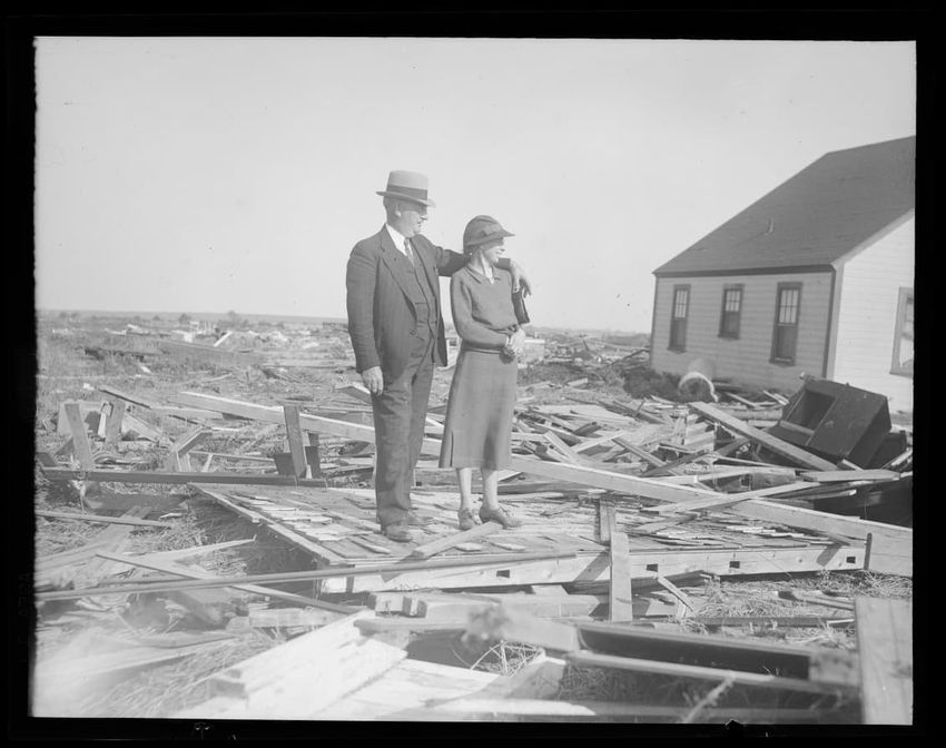 A black and white image showing what looks like a postcard of the Pleasant View House in Pleasant View, Rhode Island. The caption reads, "1938 Hurricane (before), Pleasant View House, Misquamicut, R.I. (original label) [inscription on neg.: 'Pleasant View House from the Beach, Pleasant View, R.I.']....