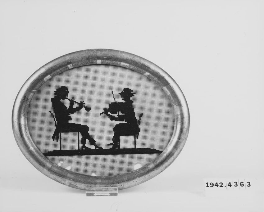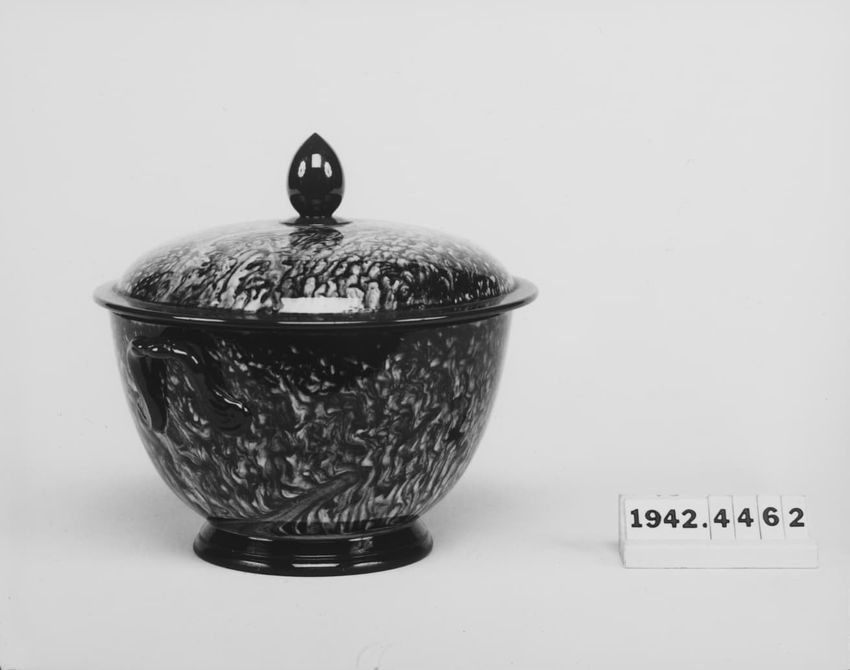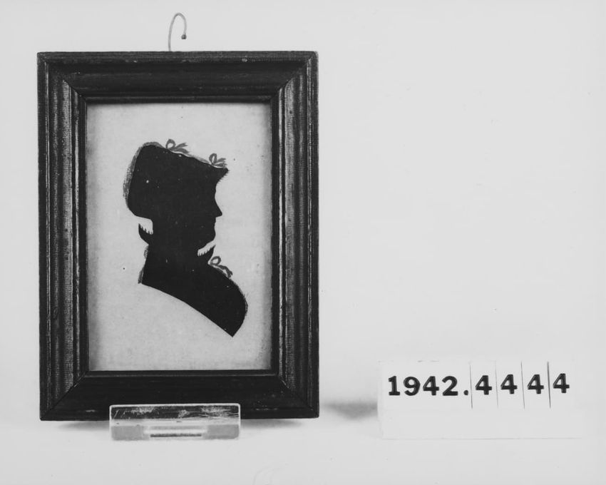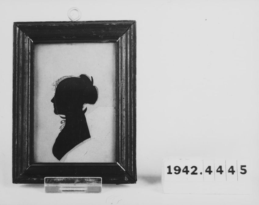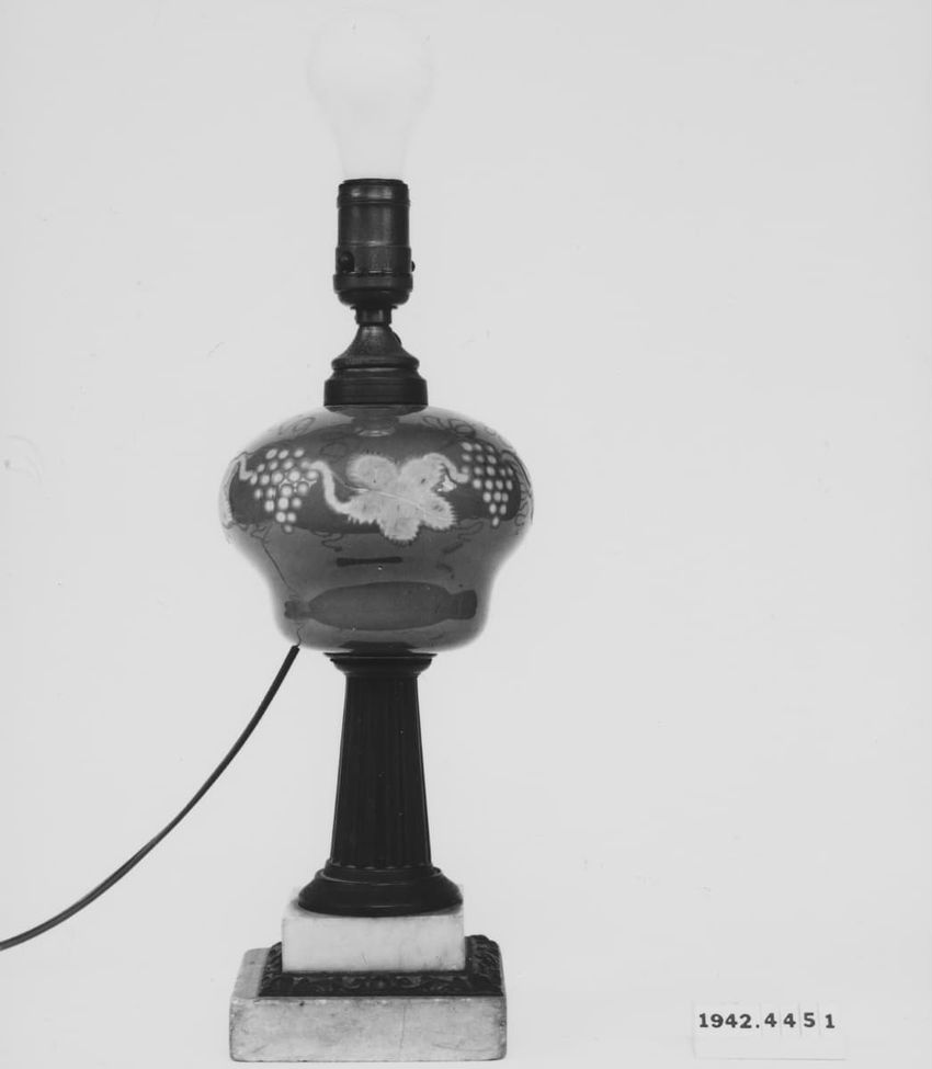 Shelf clock. Marble pedestal base with convex circular eglomise panel over watercolor drawing insert of iron bridge over water; surmounted by mahogany framed clock with enamel face, engraved on back "Wm More/Boston/Feb 15th/1806." Watercolor drawing titled "COALBROOKDALE IRON BRIDGE."