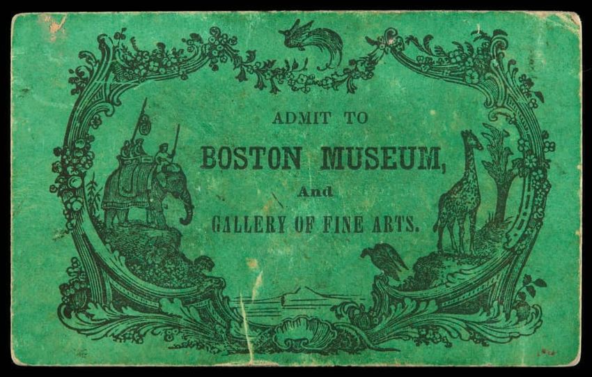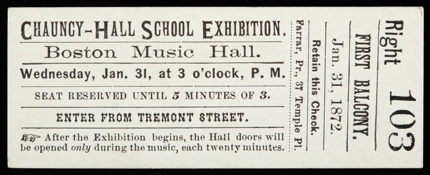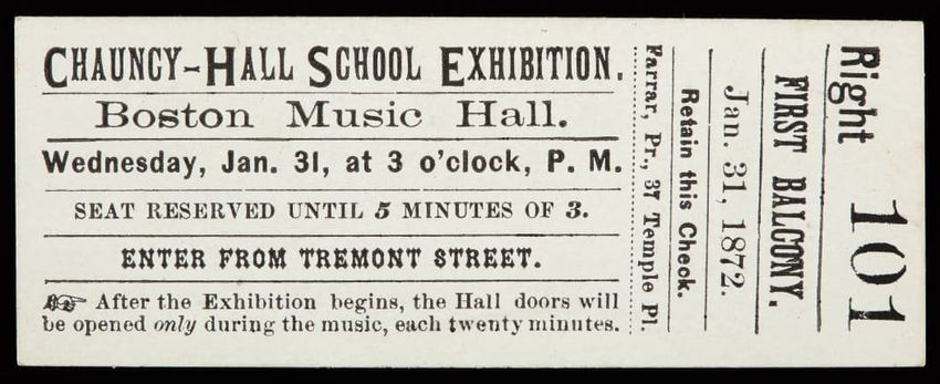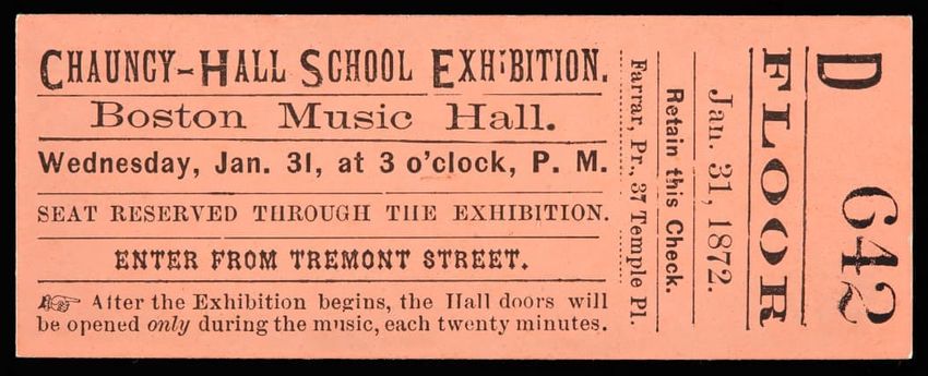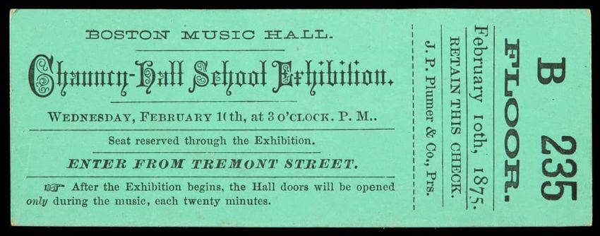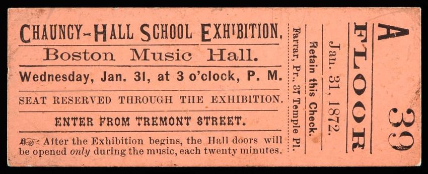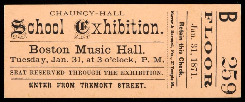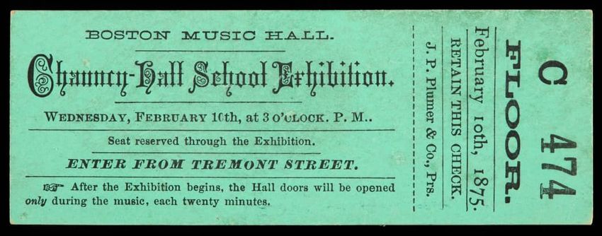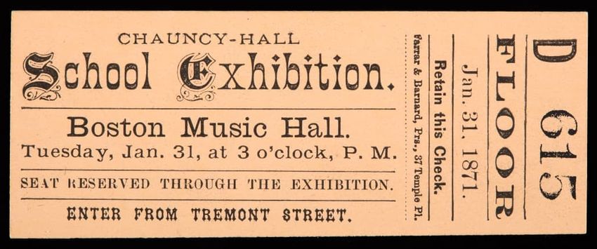 Ticket no. 46707 and attached stub for Chicago Day at the World's Columbian Exposition in Chicago, Illinois on October 9th, 1893. The front of the ticket has an illustration of a phoenix rising from a fire. The reverse of the ticket has an illustration of historic Fort Dearborn and said "Chicago, 18...