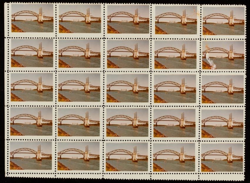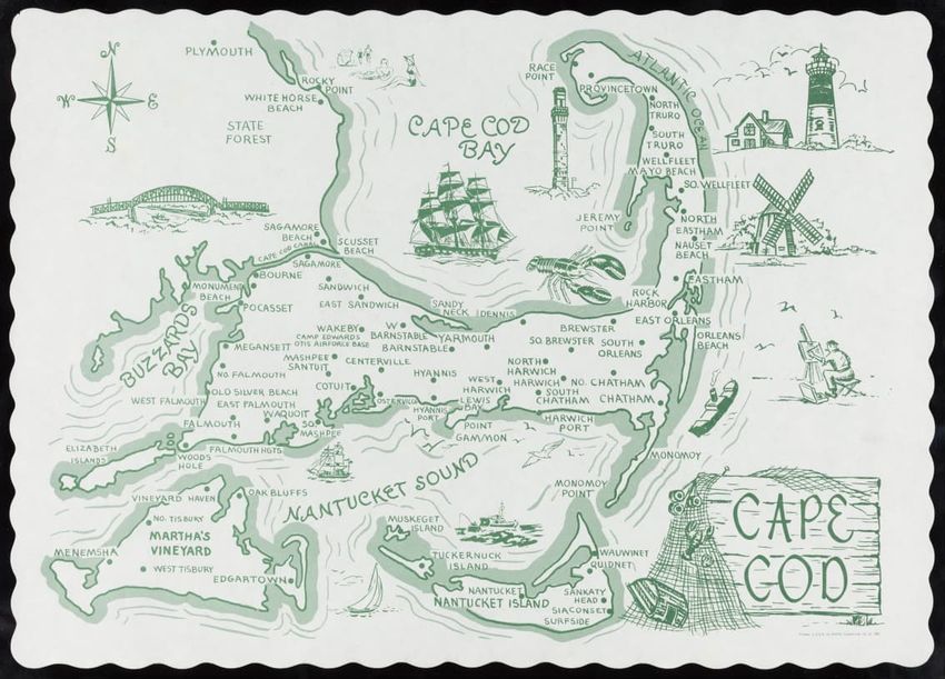 A blue tri-fold menu for the Dolphin Inn in Buzzards Bay, Mass. The menu features an illustration of a dolphin with an anchor, and it advertises that the Inn overlooks Buttermilk Bay and the Massachusetts Maritime Academy. It includes menu options such as appetizers, sandwiches, salads, entrees, and...