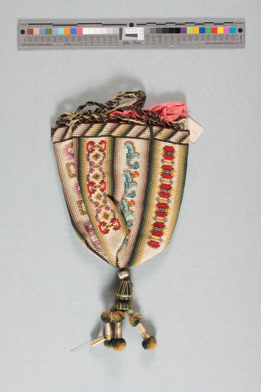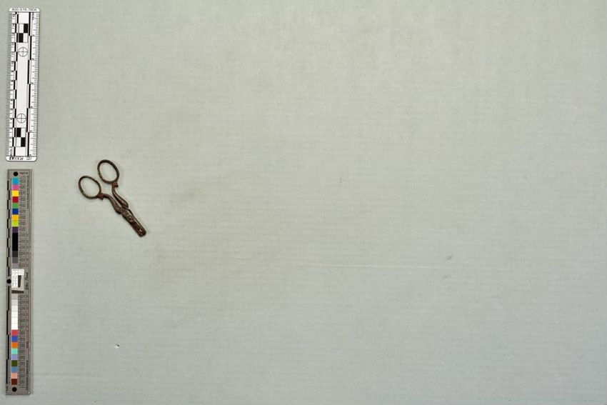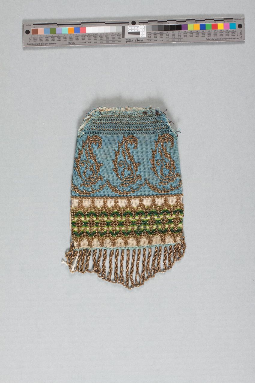 Rectangular, off white, fine cotton; single piece folded; hemmed open end with narrow line of drawnwork; band of white embroidered floral loops of bullion and French knot stitches. Line of eleven openwork crosses.