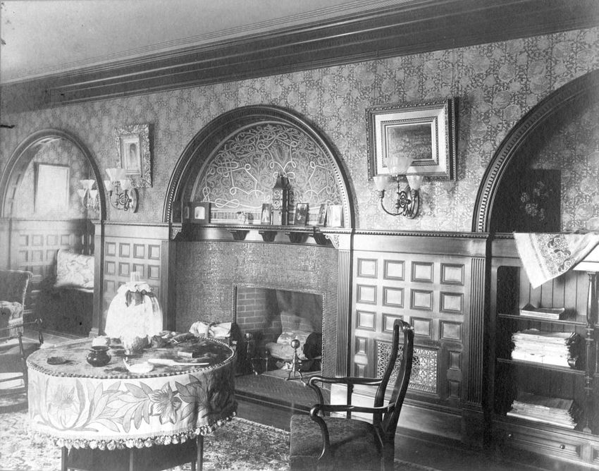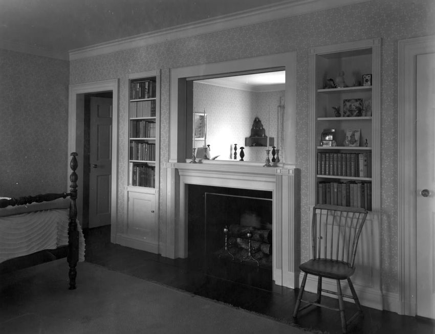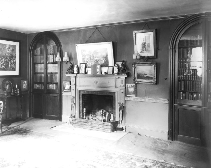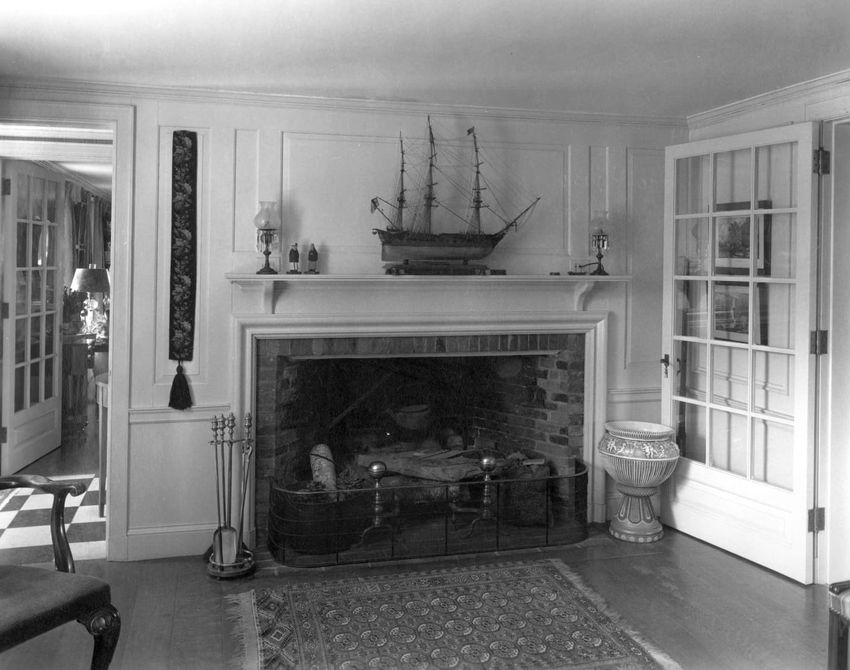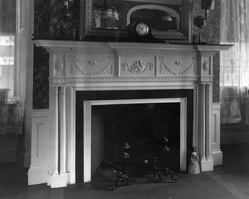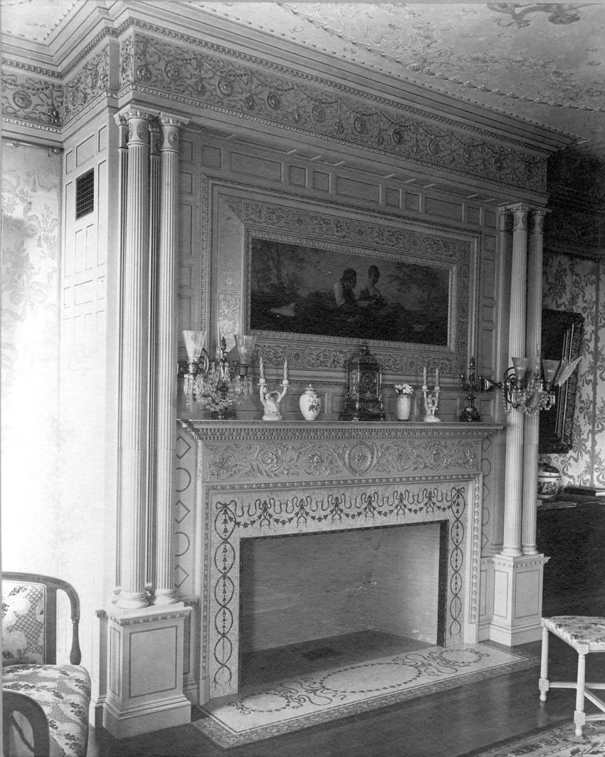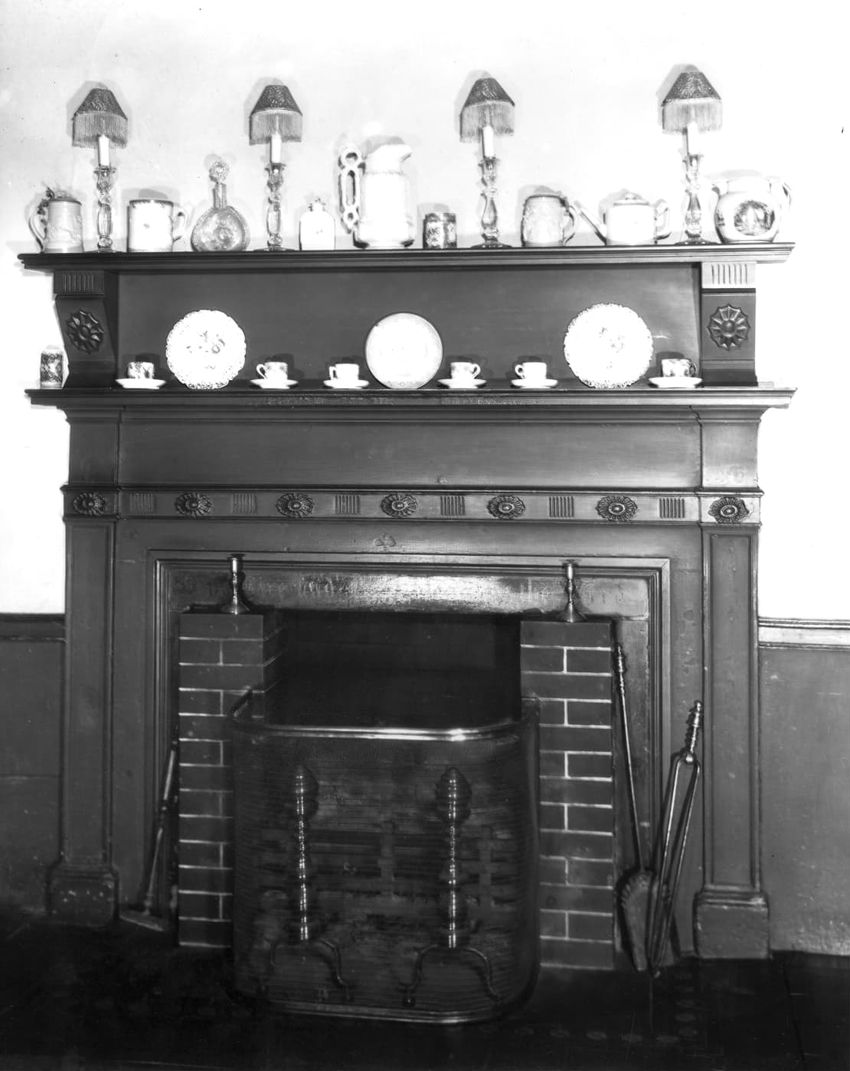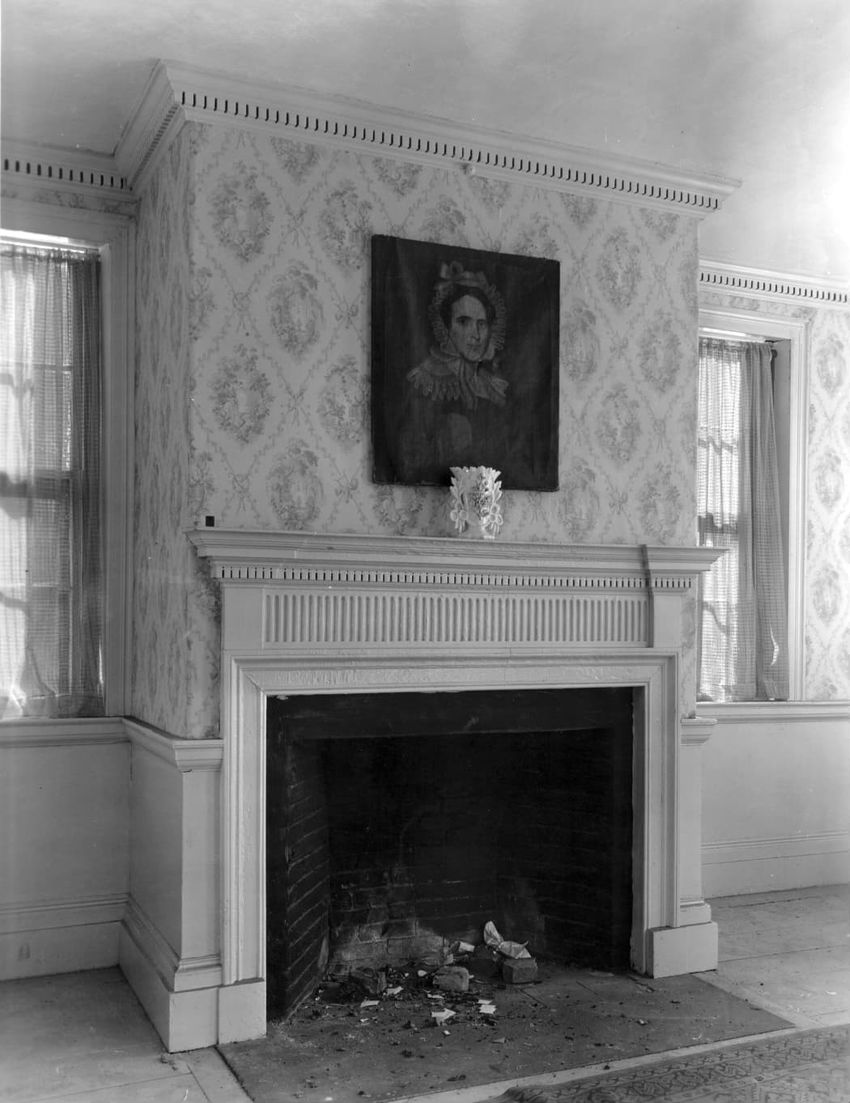 Interior photograph of a fireplace and mantel in 11 Devens St., Charlestown, Mass. There is a landscape painting sitting on top of the mantel.