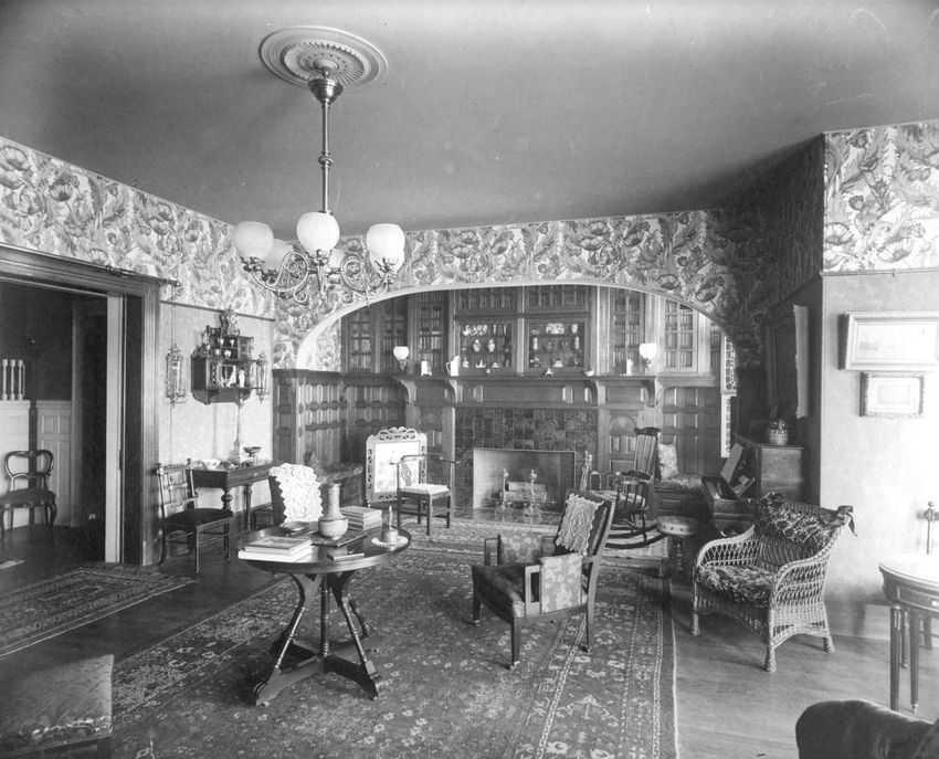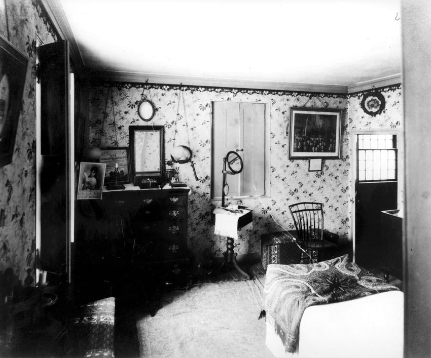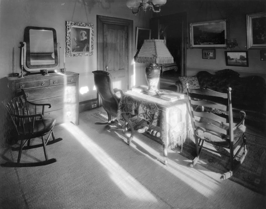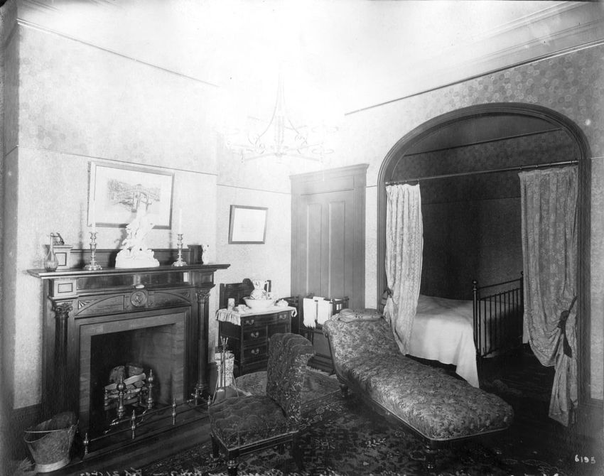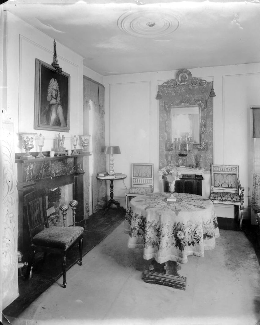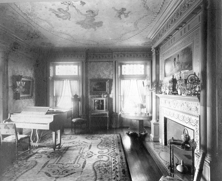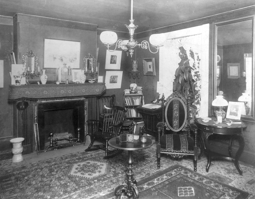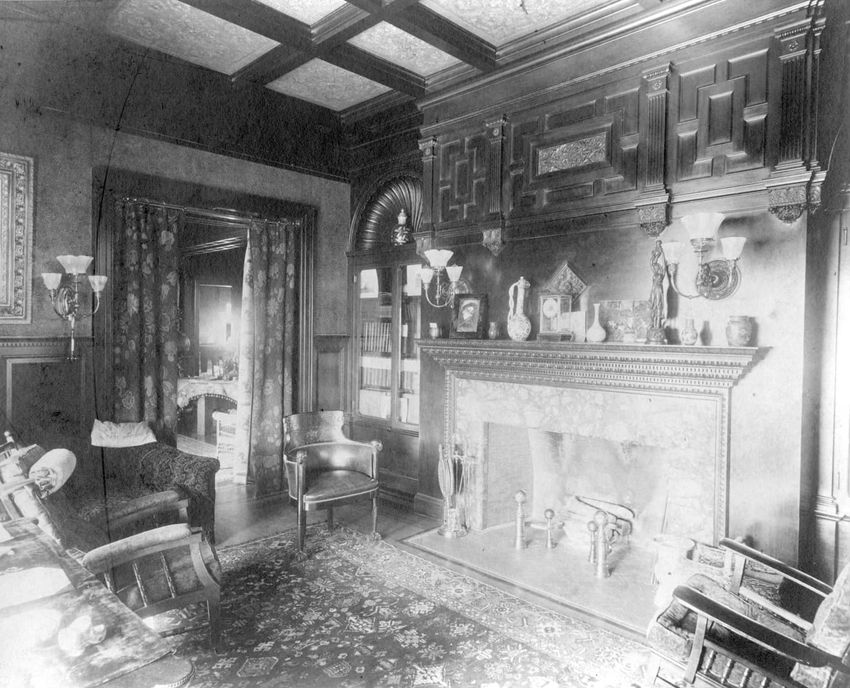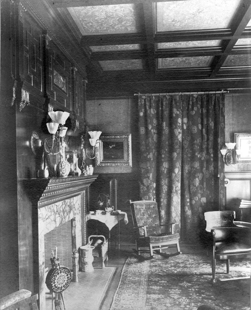 Interior photograph of a fireplace and mantel in 11 Devens St., Charlestown, Mass. There is a landscape painting sitting on top of the mantel.