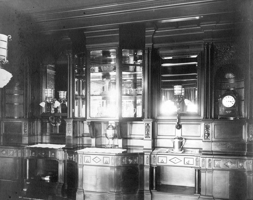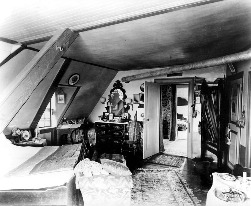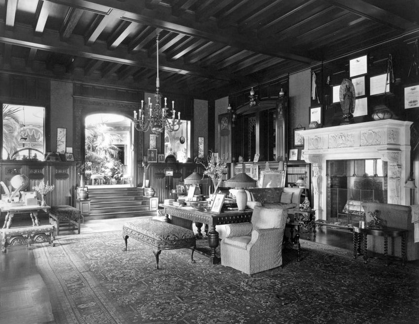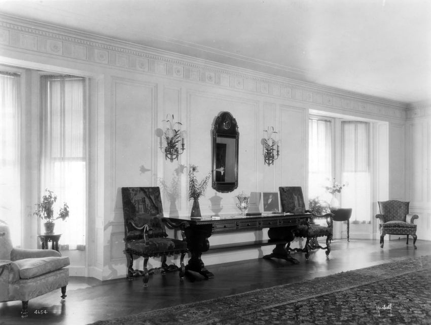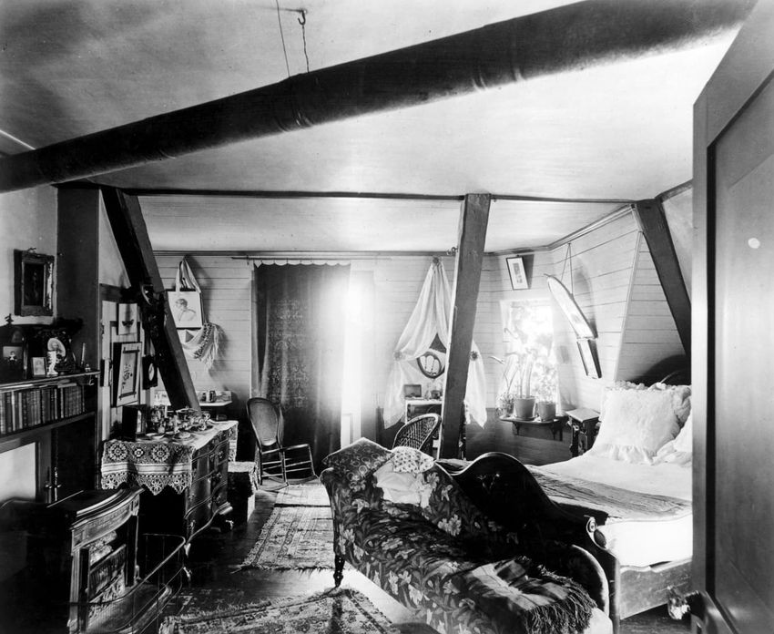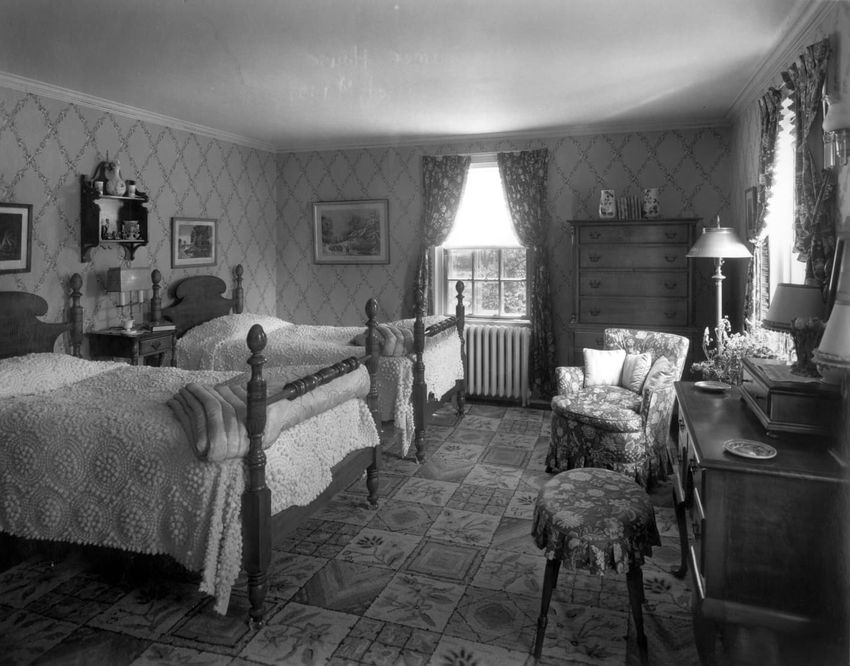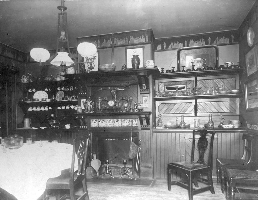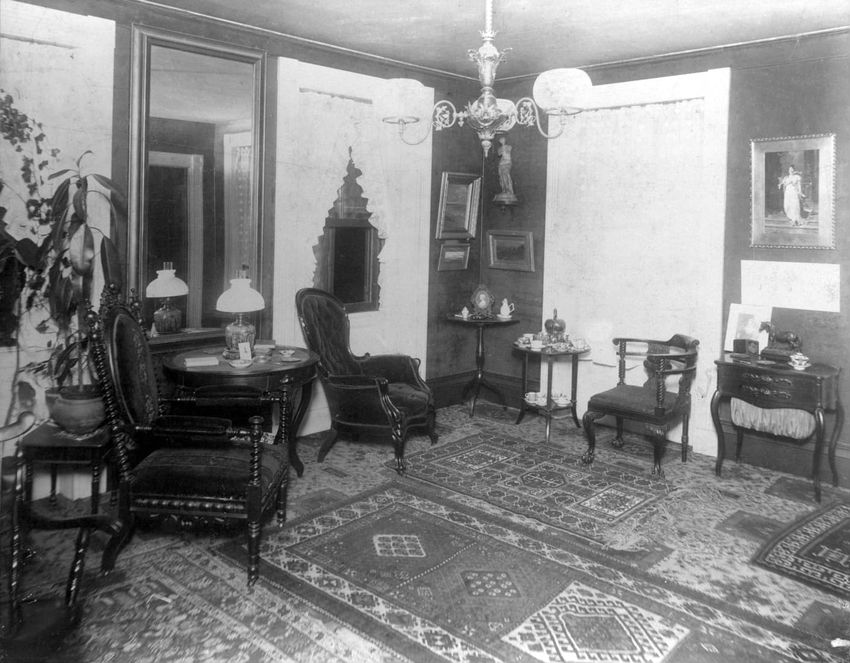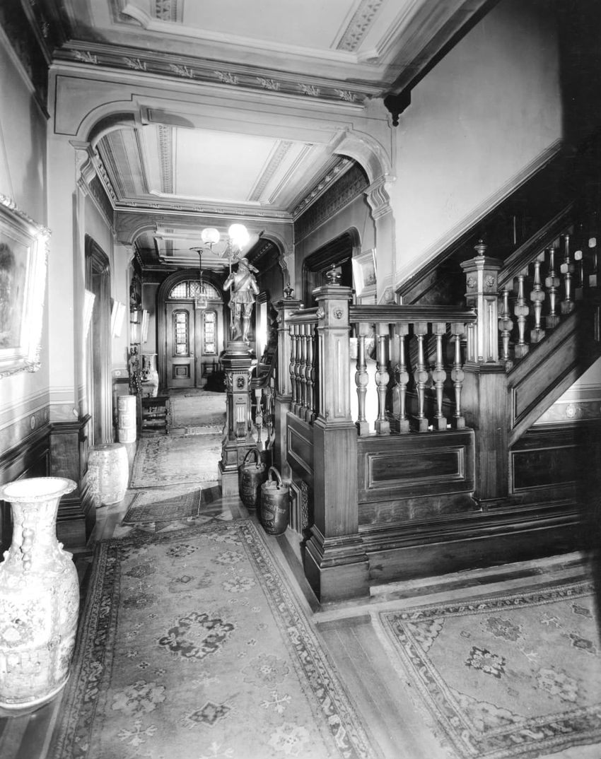 Interior photograph of a fireplace and mantel in 11 Devens St., Charlestown, Mass. There is a landscape painting sitting on top of the mantel.