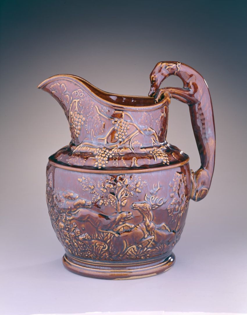 Hound-handled pitcher. Body of pitcher has a scene in relief of stags being chased by hounds. Brown glaze with yellow highlights.