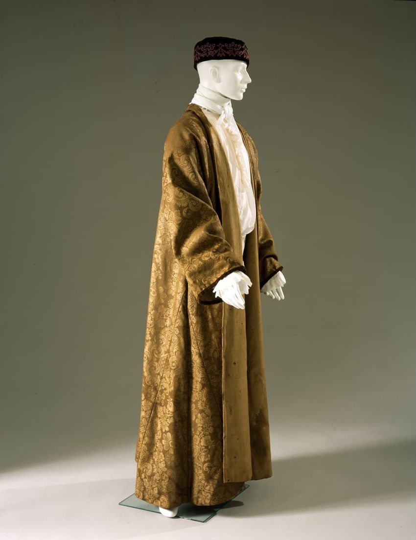 Brown wool damask banyan, lined with light brown twill; full sleeves trimmed with brown velvet; no collar, no front closure; flowers show chinese influence.