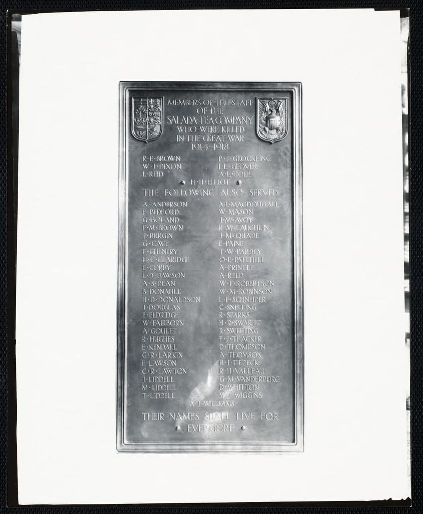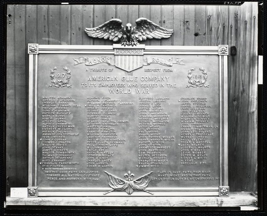 The plaque is an honor roll of American Glue Company employees who served in the first World War.