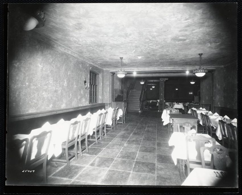 The J.J. Crimmings Company, dental materials, is on the second floor to the right on Boylston Street. P. & J. Besse, caterer and confectioner is to the right on the ground floor. A branch of the Exchange Trust Company is on the left side of the image.
