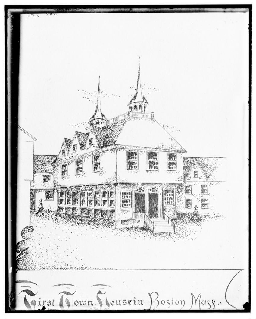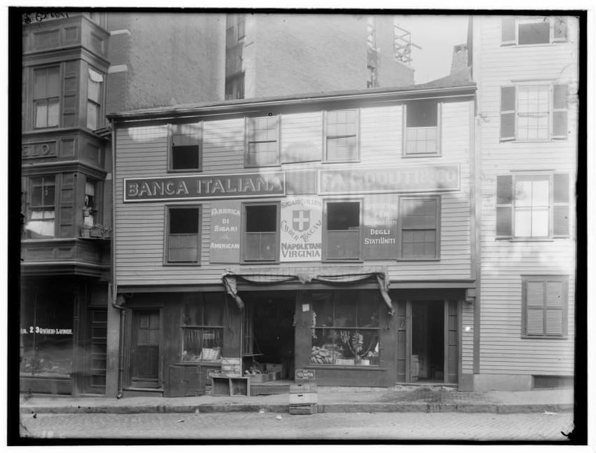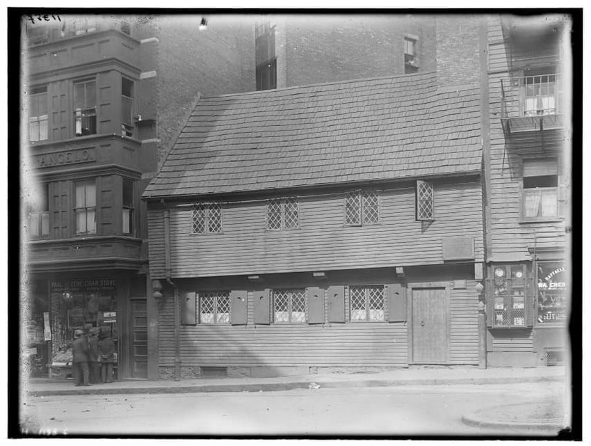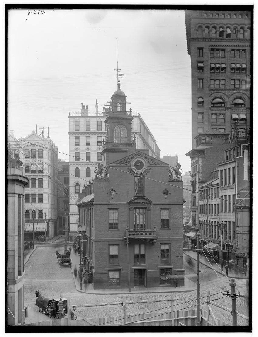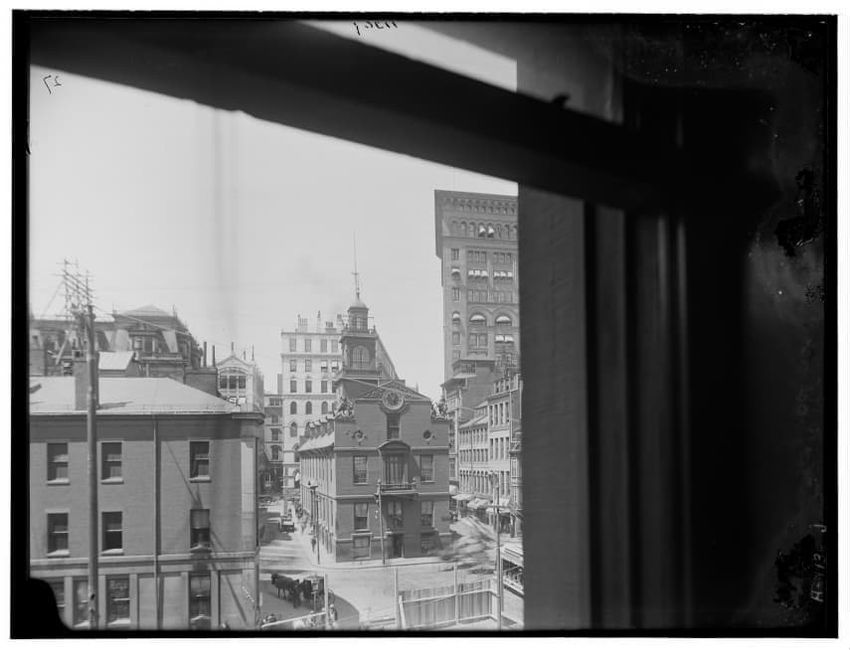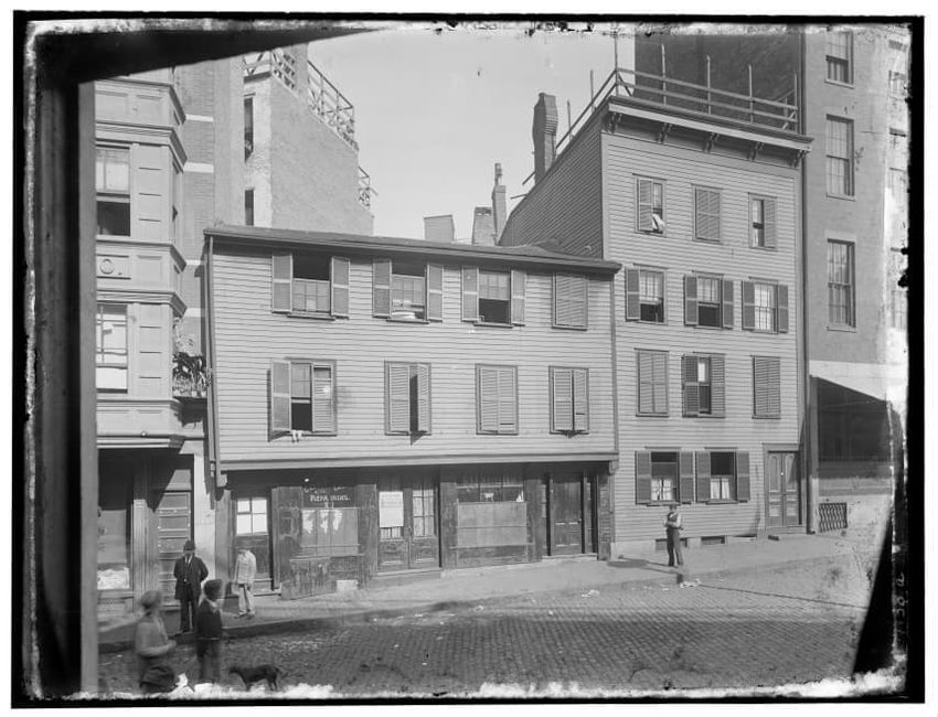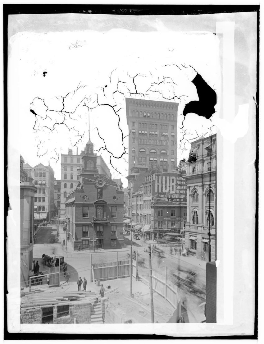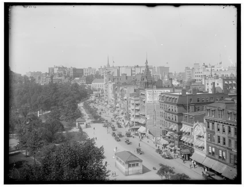 The image depicts Tremont Street in Boston, Massachusetts. The street is bustling with activity, featuring pedestrians and early 20th-century vehicles. On the right side, there are multiple multi-story buildings displaying various signs, one of which reads "THOS. A. ELSTON CO. INC." In the foregroun...
