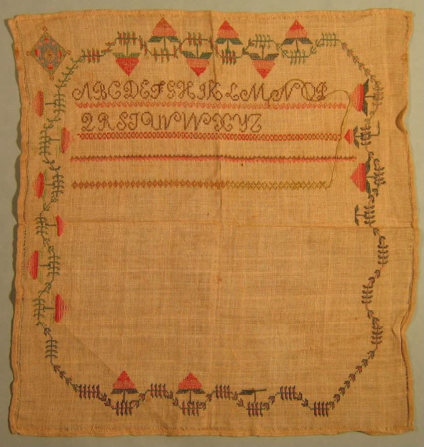Alphabet Sampler. Square, cream colored linen ground. Unfinished. Large scale strawberry vine border. Two rows of alphabet, four rows of decorative geometric needlework. Polychromatic. Alphabets: #1-complete. Other sstitches: satin stitch.