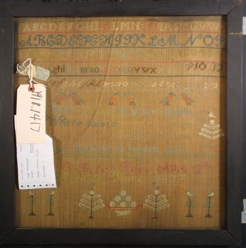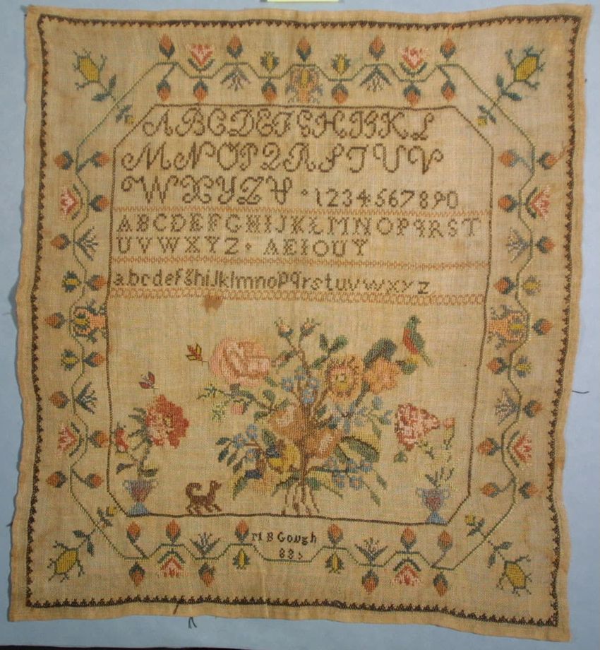 Alphabet/Verse Sampler. Squarish, cream colored linen ground. Floral border around square cross stitched inner border. Within this, flowers at four corners. Alphabets above verse below. Polychromatic. Alphabets: 3 complete alphabets Numbers: 1-10