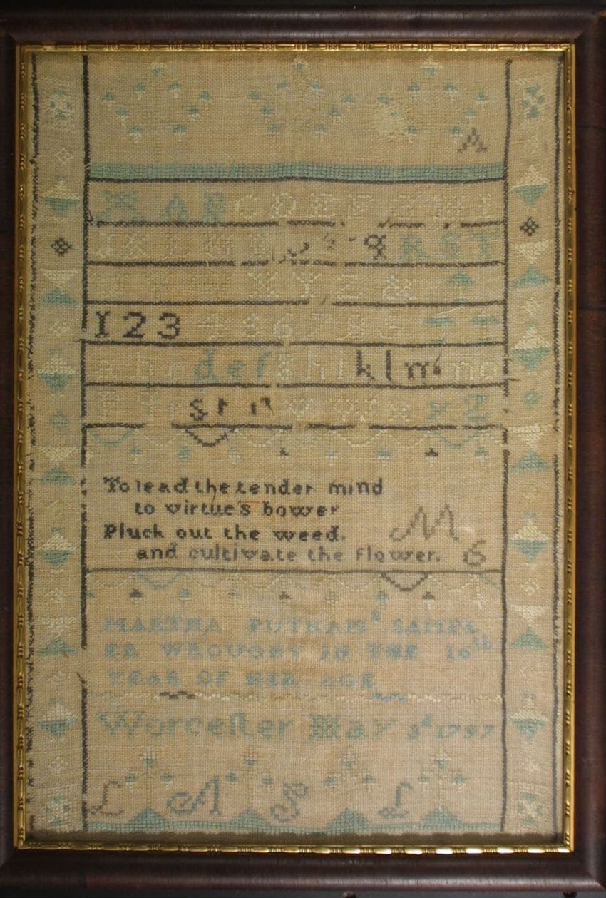 Alphabet/Verse Sampler. Vertical rectangle, cream colored linen ground. Geometric floral border. Alphabet and numbers at top, verse below. Monochromatic-shades of green. 2 Alphabets: #1-complete #2-missing "J" Numbers:1-9; framed, under glass.