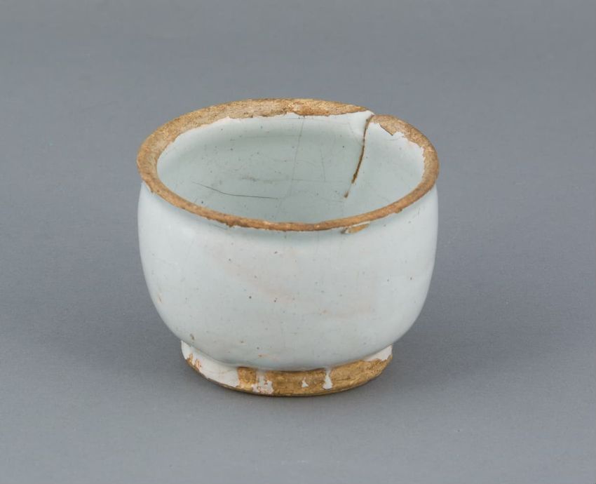 Grayish-white glazed earthenware tea bowl with slightly flared rim.