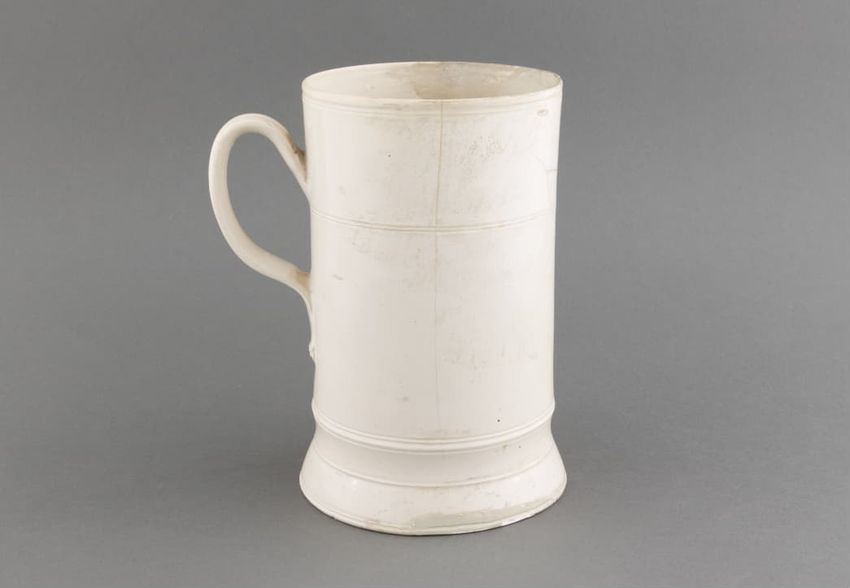 Stoneware handled mug. Horizontal molded bands. Scroll molded handle.