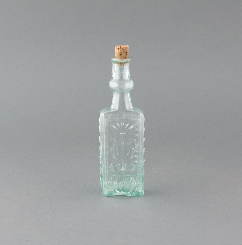 Green-tinted glass perfume bottle with molded scroll and stylized floral design, cork stopper.