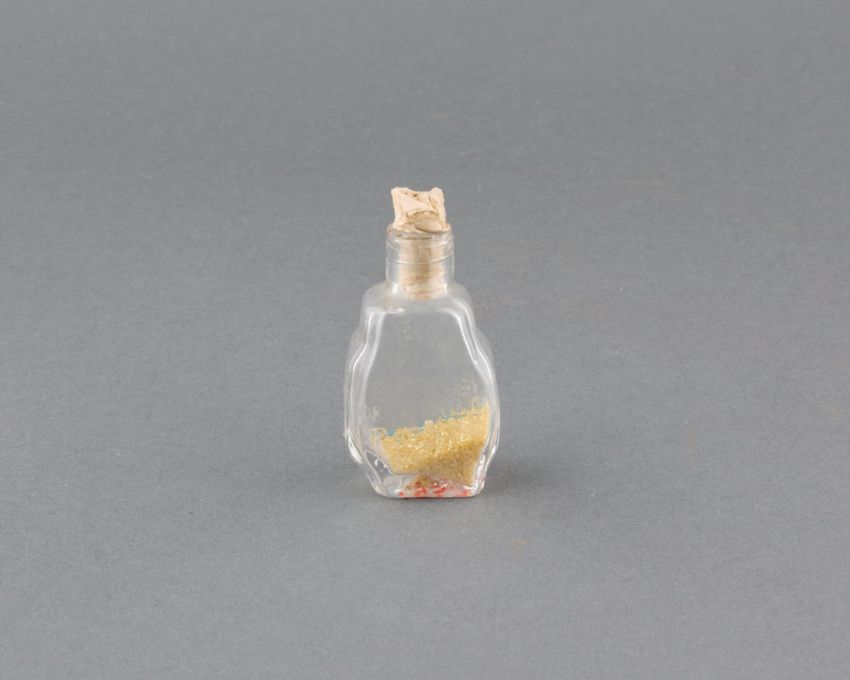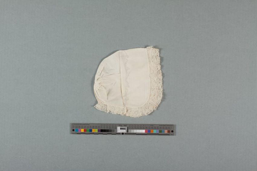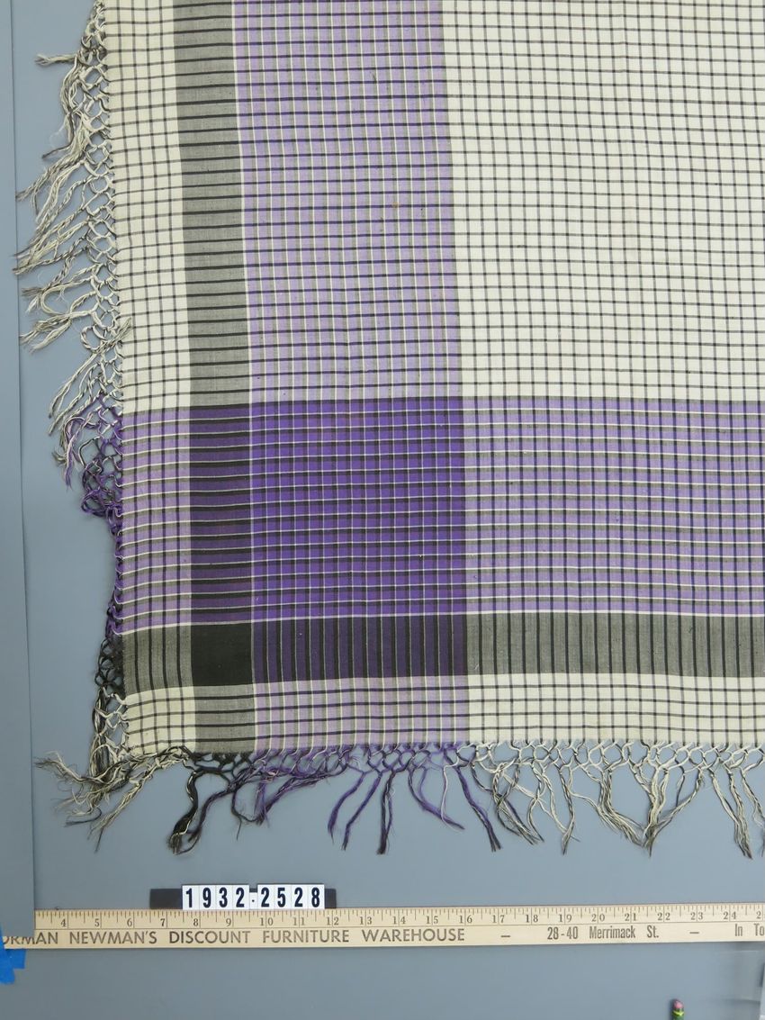 White quilted silk with padded filling; scoop neck with 2 snaps at one shoulder seam; angled corners; bib-like.