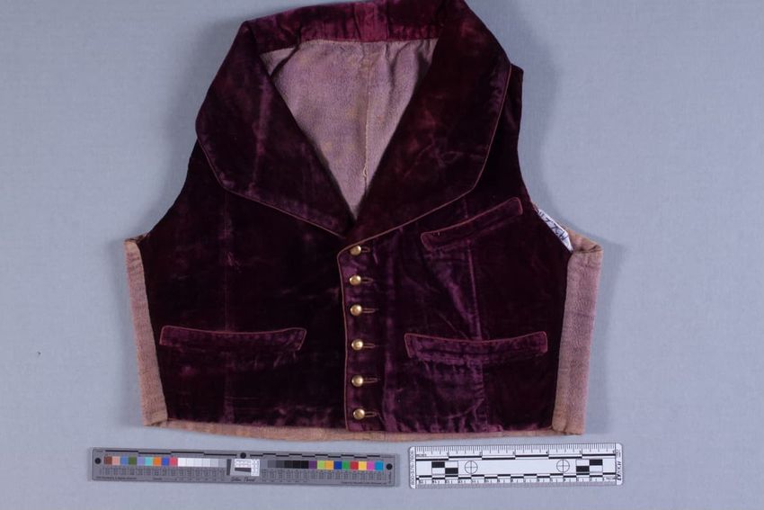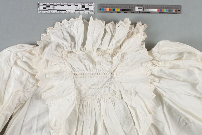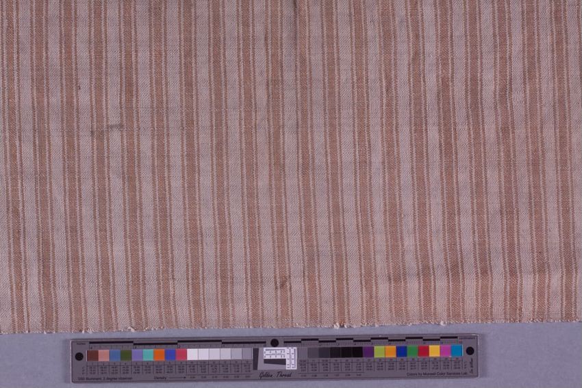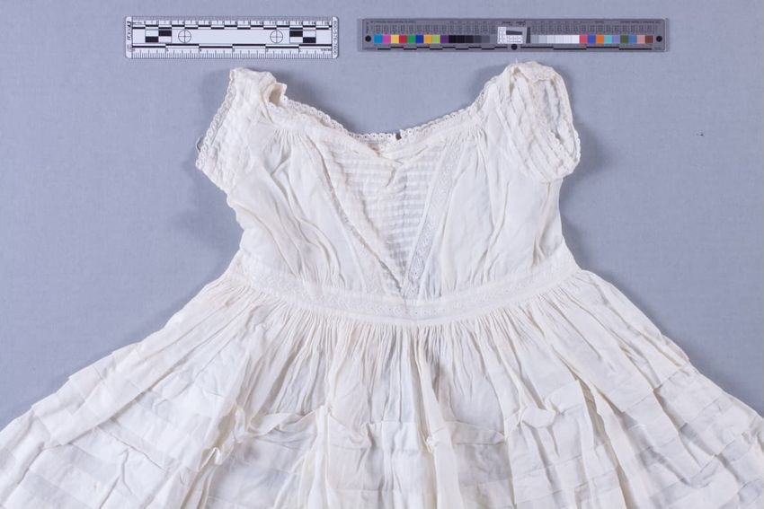 White printed w/ red paisley and dotted pattern; lace at neckline and sleeves w/ fine mull undersleeves; shirred bodice w/ skirt gathered all around onto waistband; piping at neckline, armseye and waist; 2 tucks at hem, w/ hook and eye closure; bodice lined w/ white cotton.
