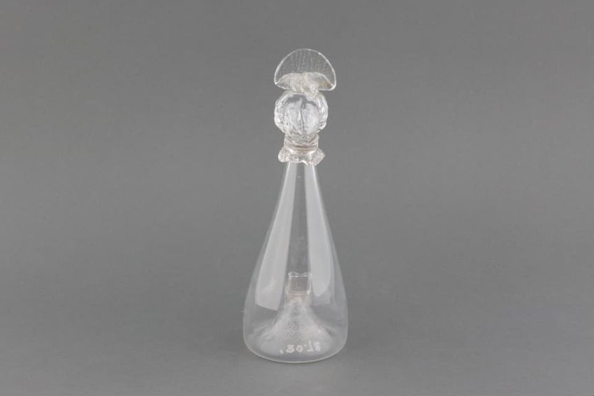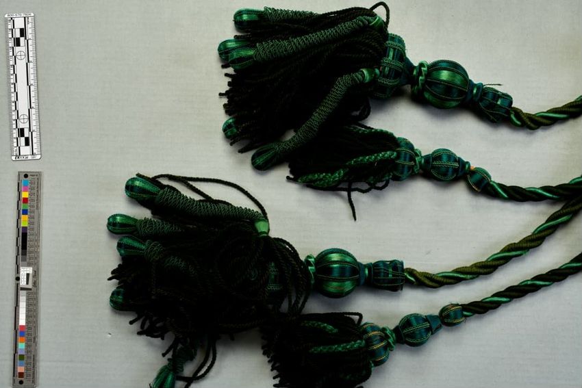 Brown, tan and cream silk plaid, with black chine stripe; quilted with six casings, with piping at back, forming six puffed bands, lined with batting; narrow self-ruffle around brim; wide neck ruffle lined with thin layer of batting; center back horseshoe shaped panel trimmed with bow of same silk; ...