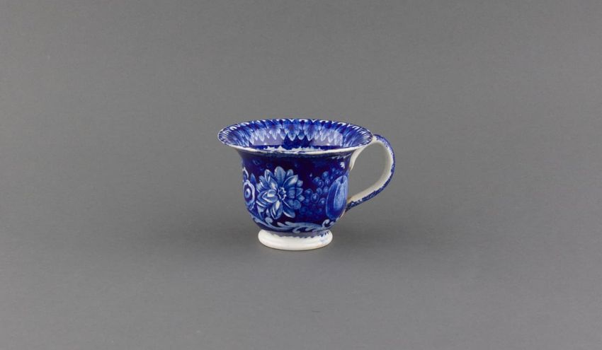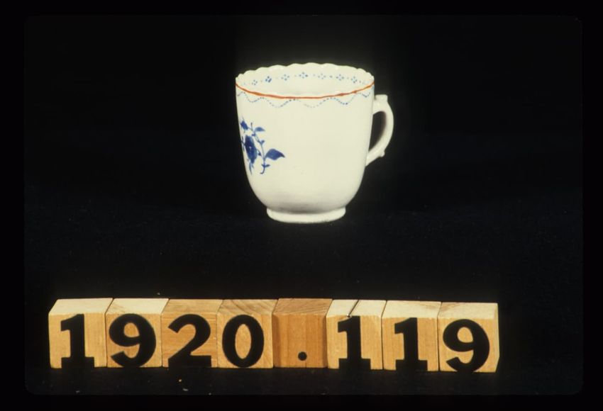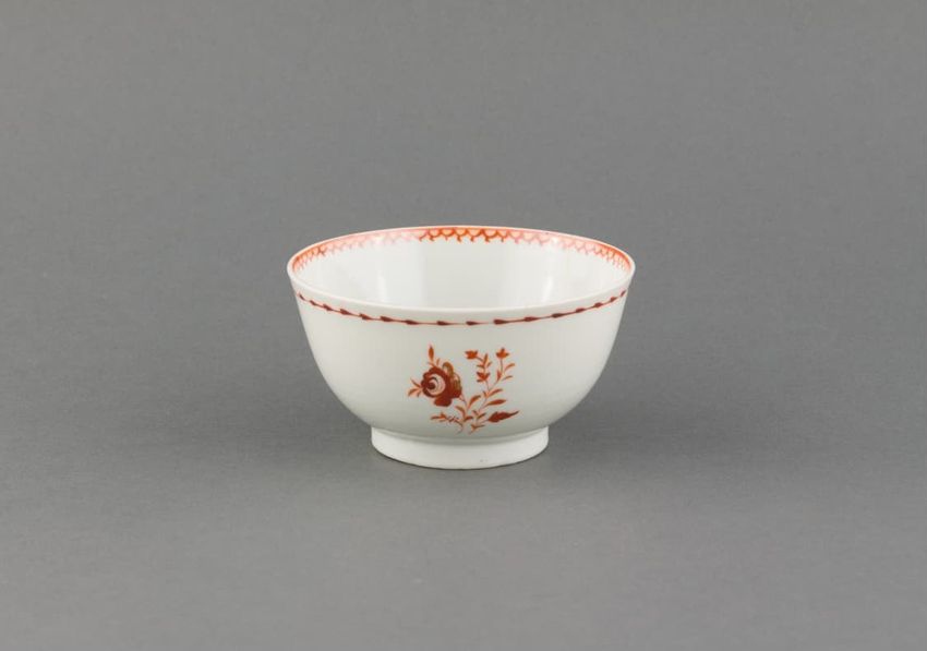 Scalloped edge with thin orange line and border of pink scrolled lattice medallions and pink, green, and oragne beribboned sprigs of flowers; tiny pink and green enamel flower buds around well, surrounding central enamel spray of pink rose with smaller flowers, green leaves, cash symbols and gilt ri...