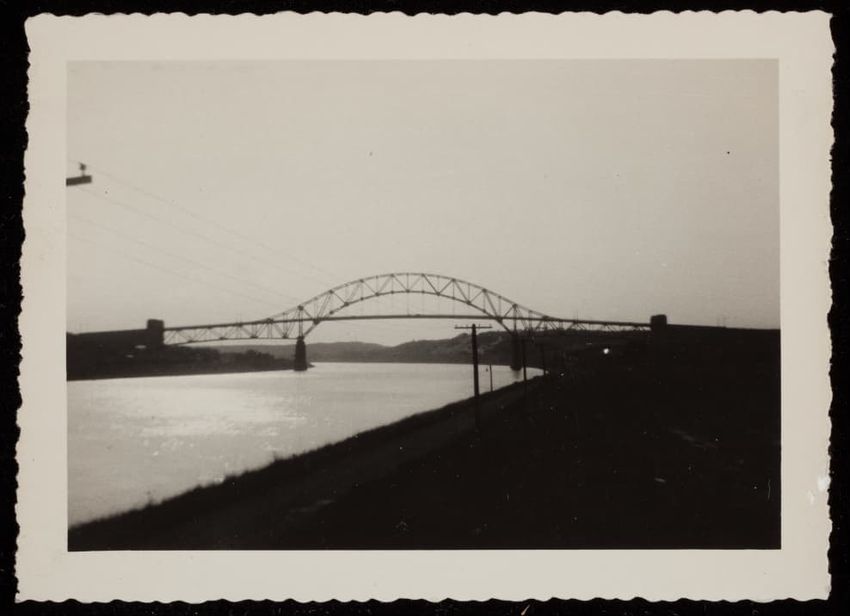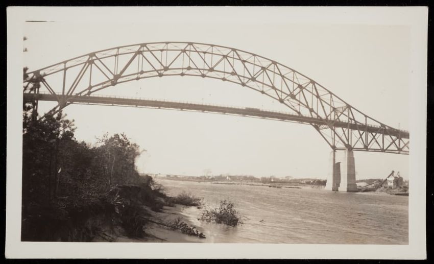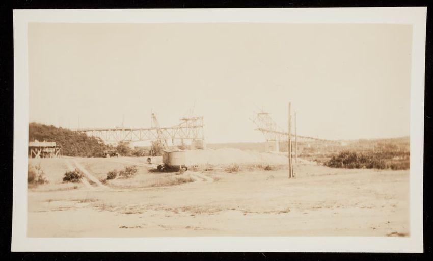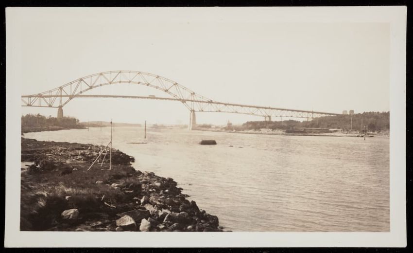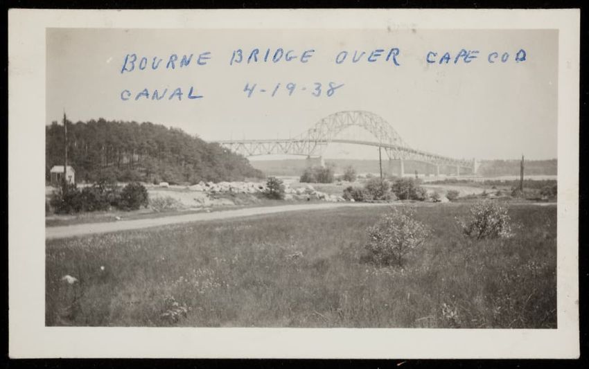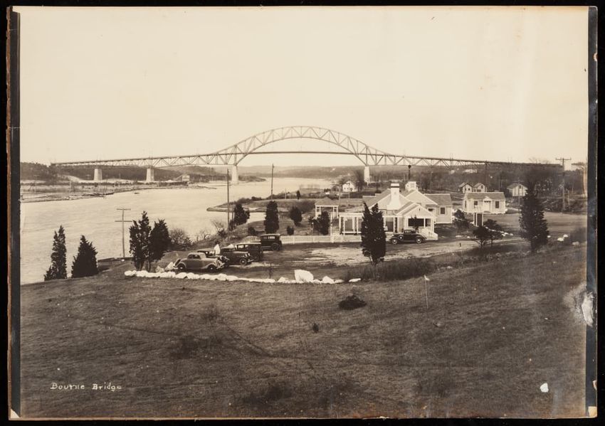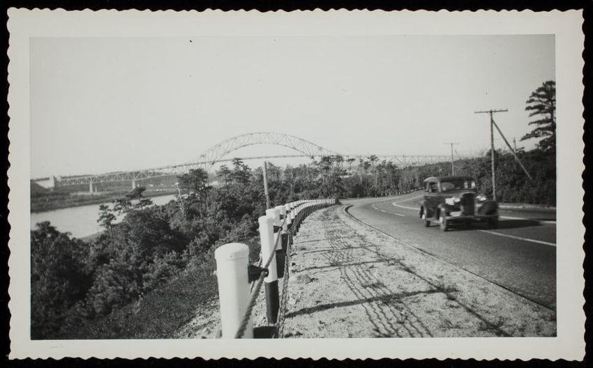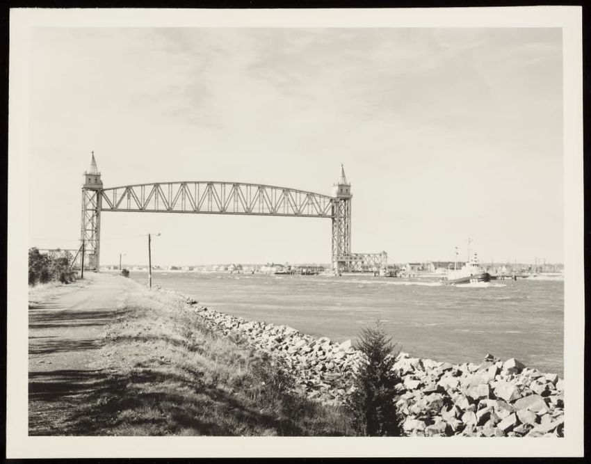 A black and white view of the Bourne Bridge over the Cape Cod Canal in the distance, seen from a road. The guardrail is visible in the foreground, and there is a field between the viewer and the canal.