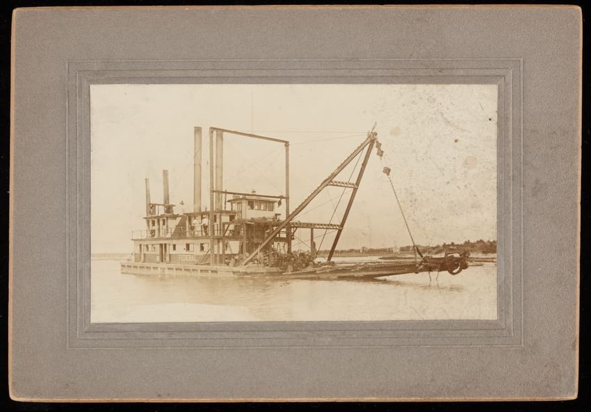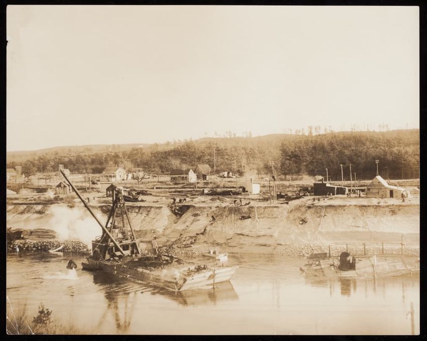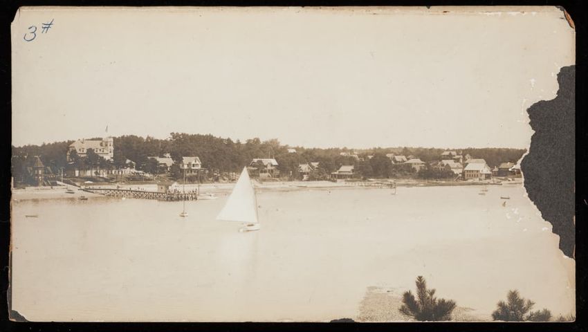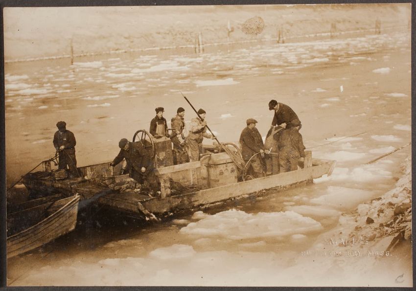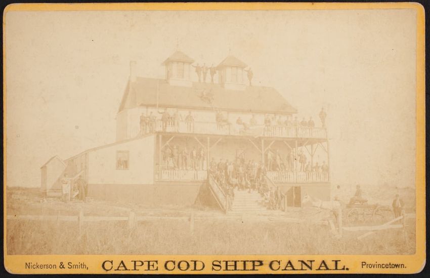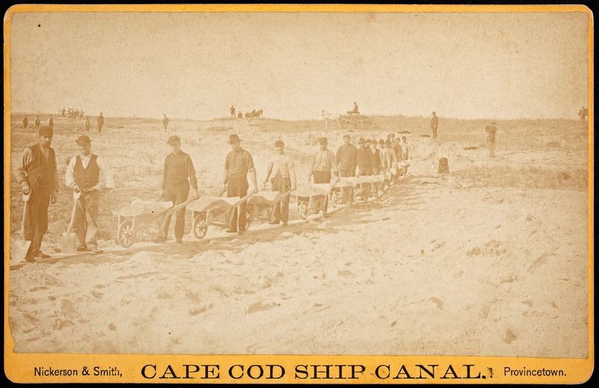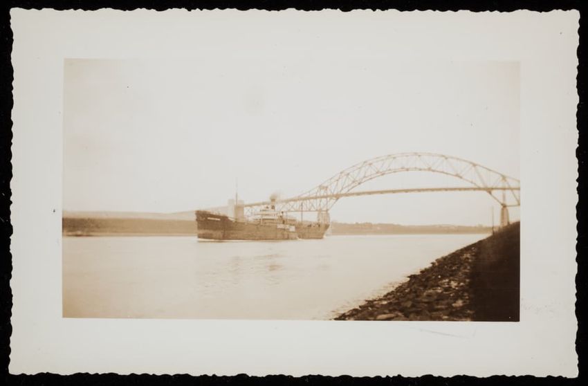 A black and white view of the Bourne Bridge over the Cape Cod Canal in the distance, seen from a road. The guardrail is visible in the foreground, and there is a field between the viewer and the canal.