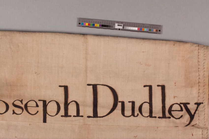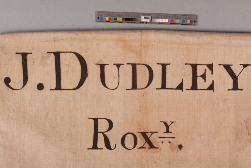 Alphabet sampler, lines divided by rows of cross stitching. Border on top edge followed by Greek key-type pattern and X-pattern. Bottom border of an undulating vine. Alphabets: #1 double letters, missing "U"; #2 missing "J". Numbers: "1-14".
