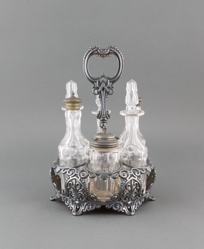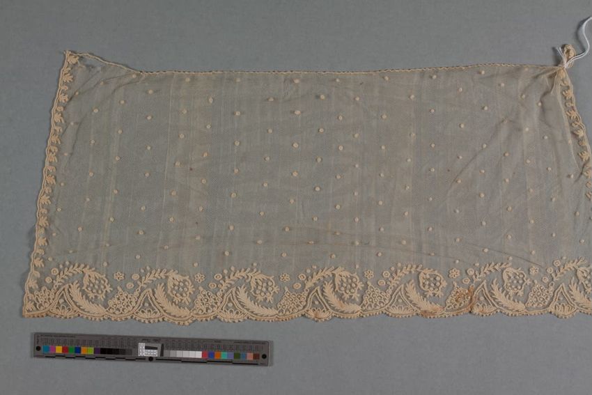 Blue figures silk damask, floral garland stripe; twill ground; brim is stiffened with wire to stand almost upright; brim has rounded edges; crown is trimmed with self-piping and self-ribbon bow, also trimmed with beige silk fringe; beige satin bow above neck brim and neck ruffle lined with chartreus...