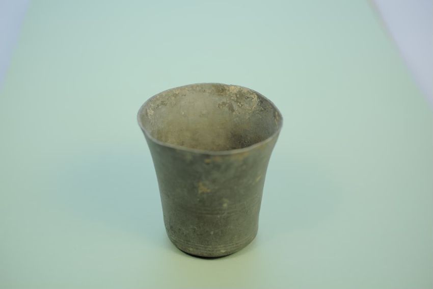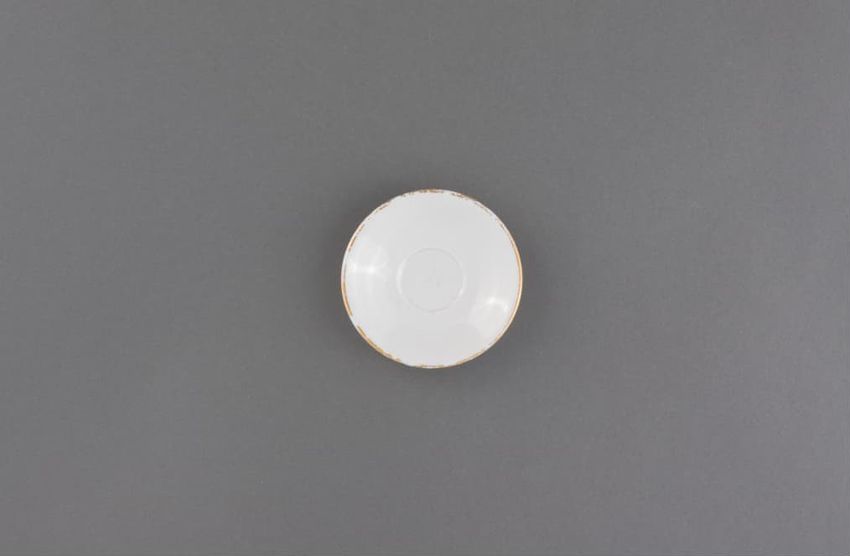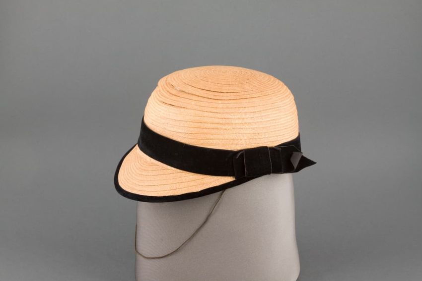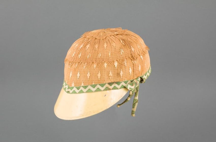 Broad sandalwood sticks; heavily carved with openwork floral motif; set with spangles; lithographed and handpainted paper leaf, figures on one side, harbor scene on reverse; mother of pearl washer; carved metal ring; blue silk cord and tassel.