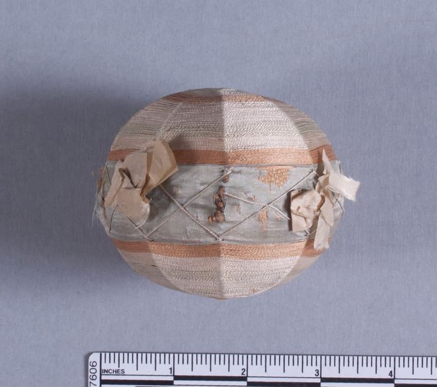 Ball shaped pincushion with alternation bands of silk thread (yellow, off-white, blue); 1 inch blue silk band around middle with silk bows and cross stitch design; stuffinf made of wool and corded into eight sections.