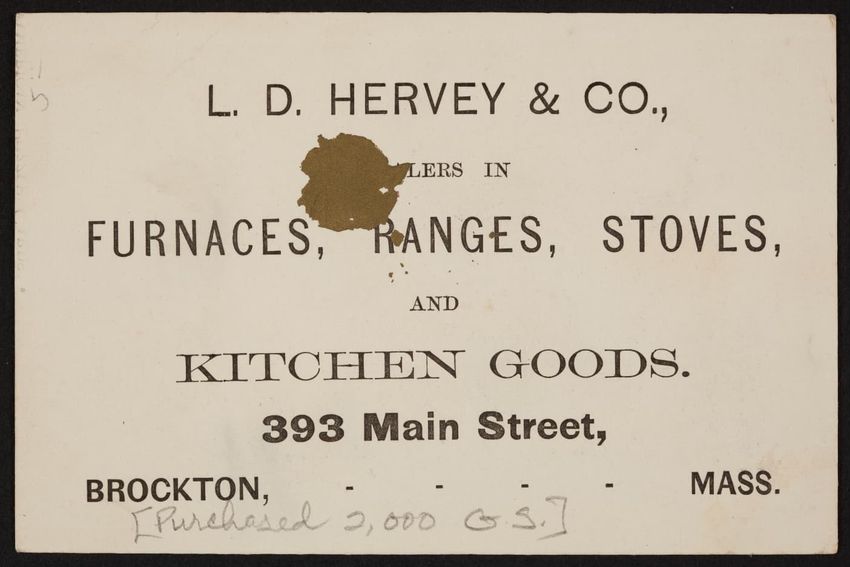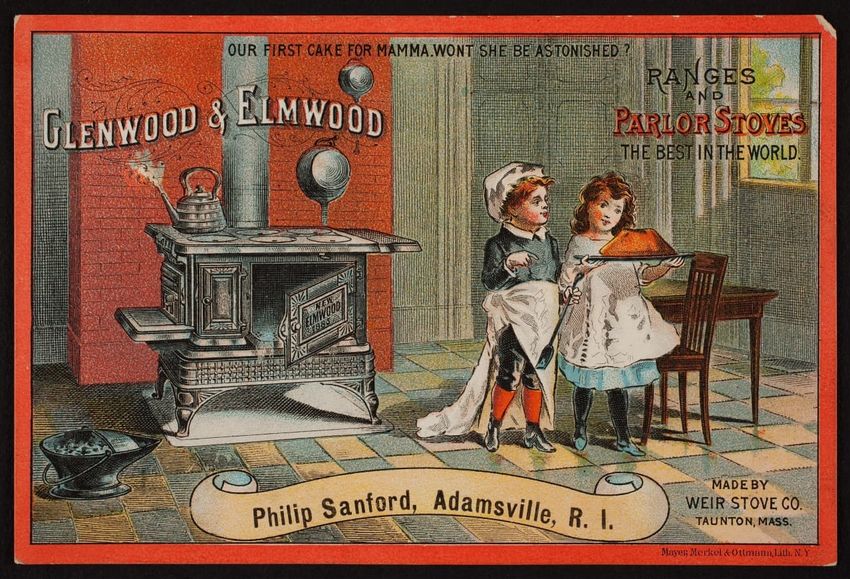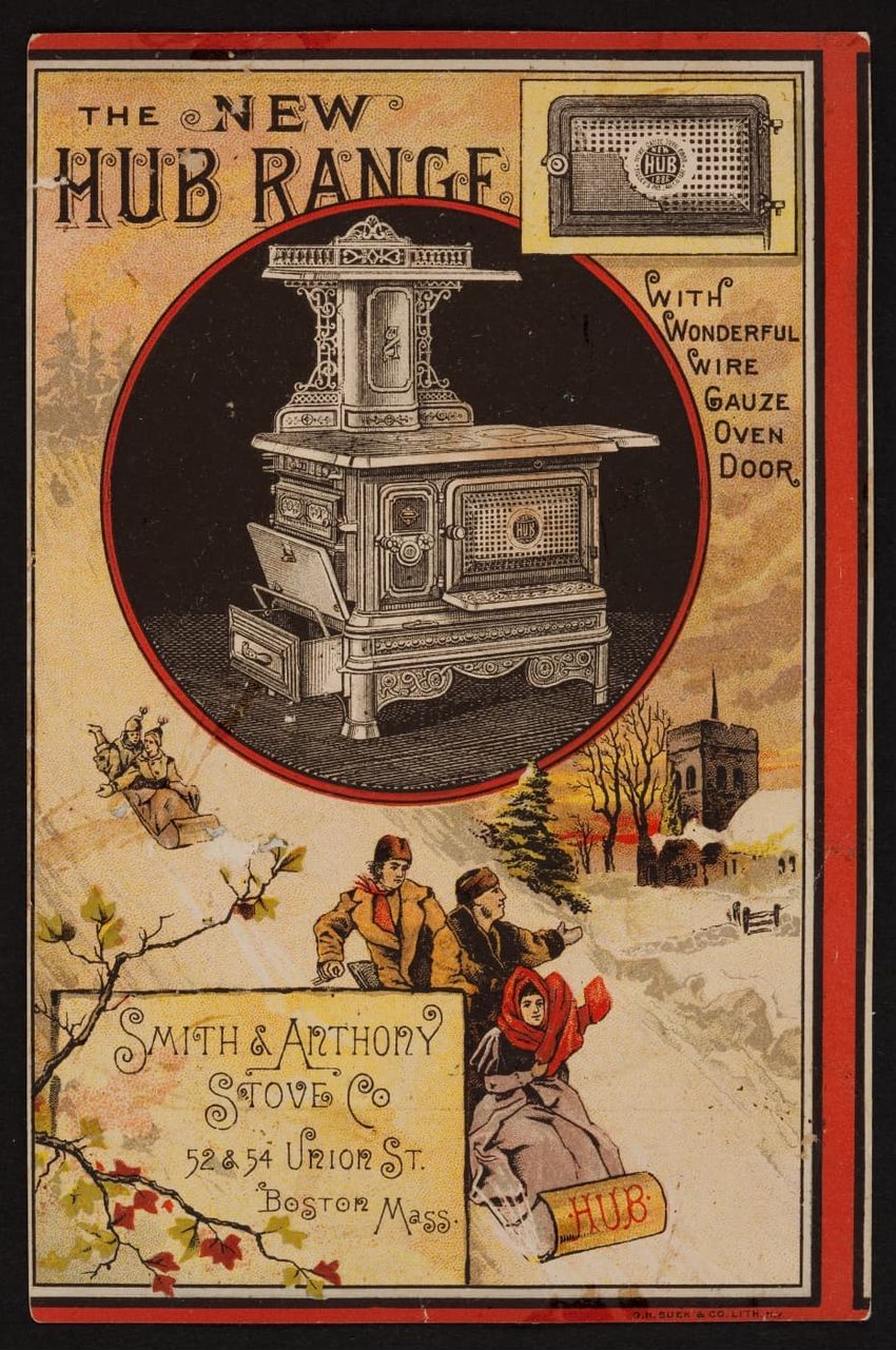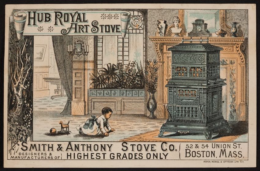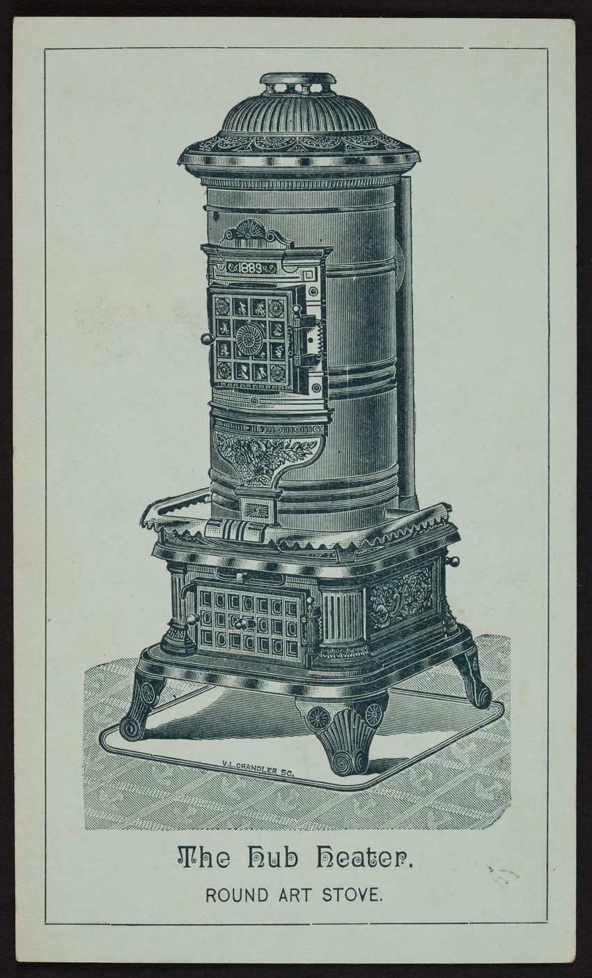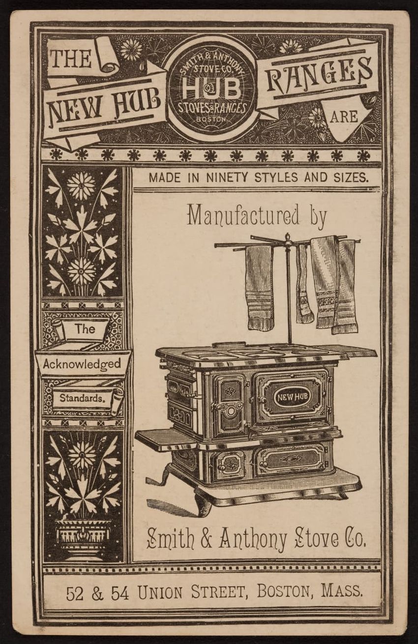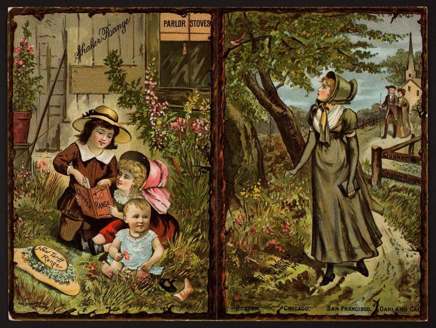 Within the illustrations are the names "Shaker Range Parlor Stoves," "New Tariff Ranges" and "Quaker & Shaker Ranges." The lower right hand side of the illustration reads "Boston, Chicago, San Francisco, Oakland, Calif." The card verso has an illustration of the Quaker Portable Range. The Taunton Ir...