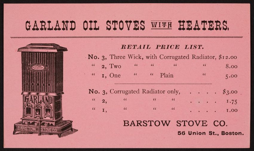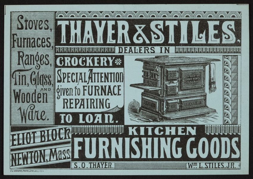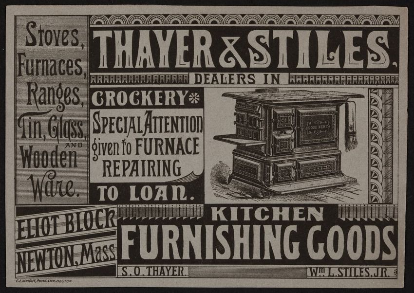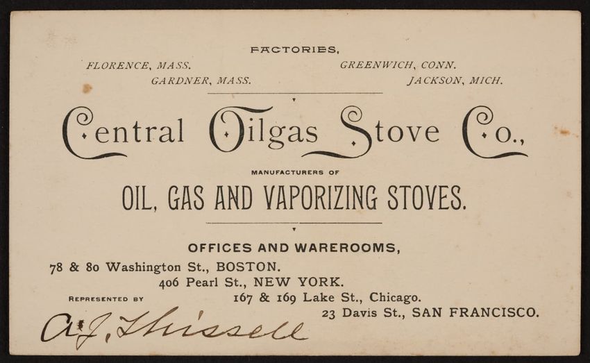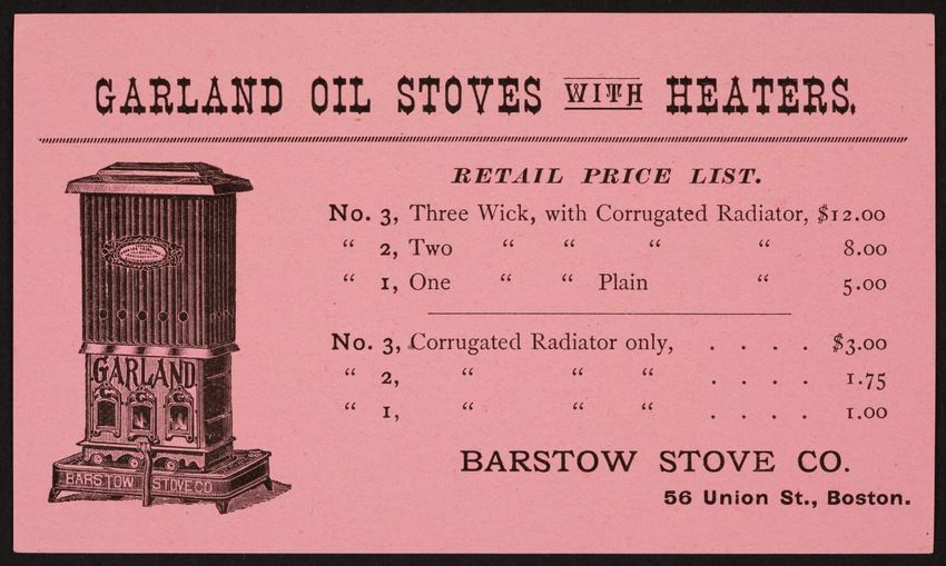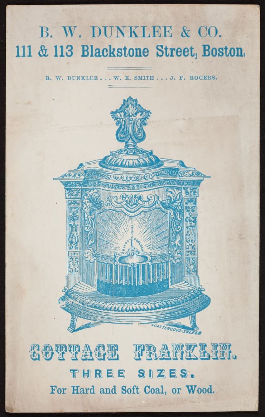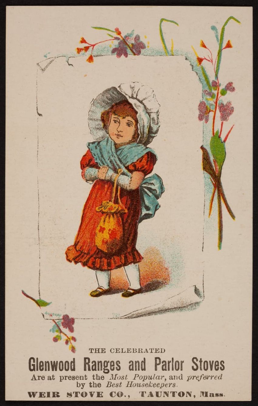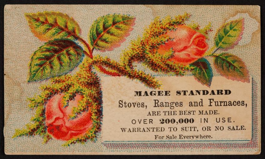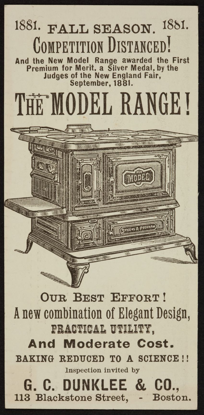 Within the illustrations are the names "Shaker Range Parlor Stoves," "New Tariff Ranges" and "Quaker & Shaker Ranges." The lower right hand side of the illustration reads "Boston, Chicago, San Francisco, Oakland, Calif." The card verso has an illustration of the Quaker Portable Range. The Taunton Ir...